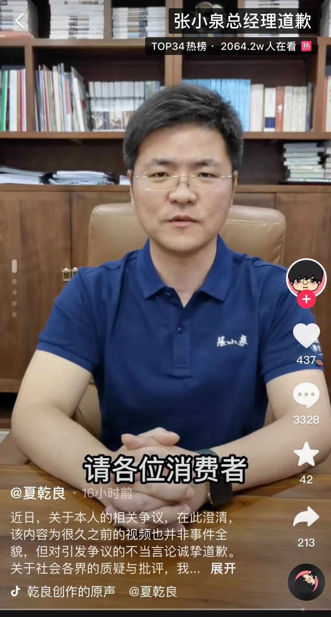 舆论不断发酵,品牌被推上风口浪尖,张小泉公司总经理用个人抖音账号发布了道歉视频。