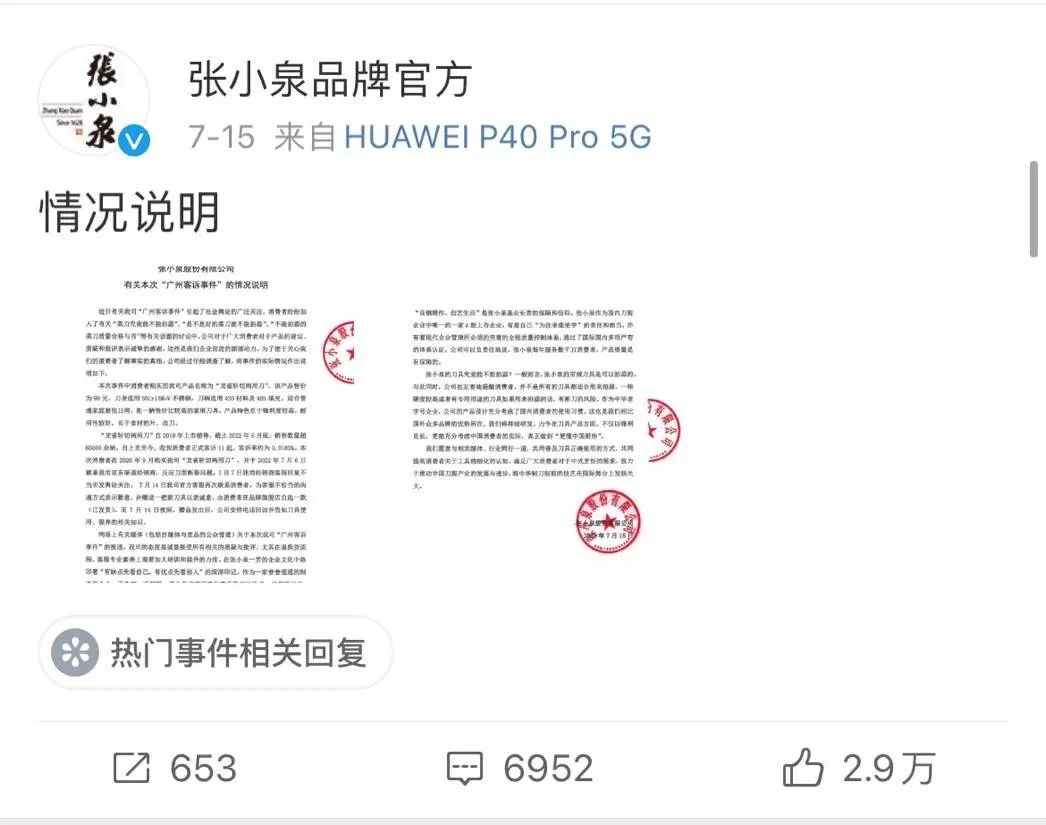 原本只是一把刀的质量问题,如今却上升为品牌危机。