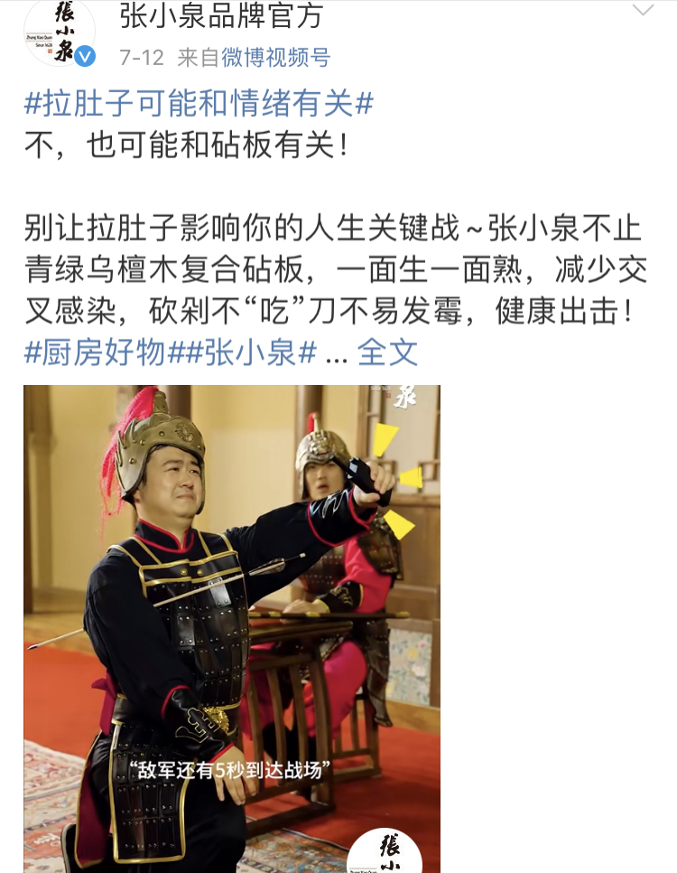 为推广最新发布的不锈钢复合砧板,张小泉还在官微推出一则趣味短视频,用生动好玩的剧情来阐释产品优势。