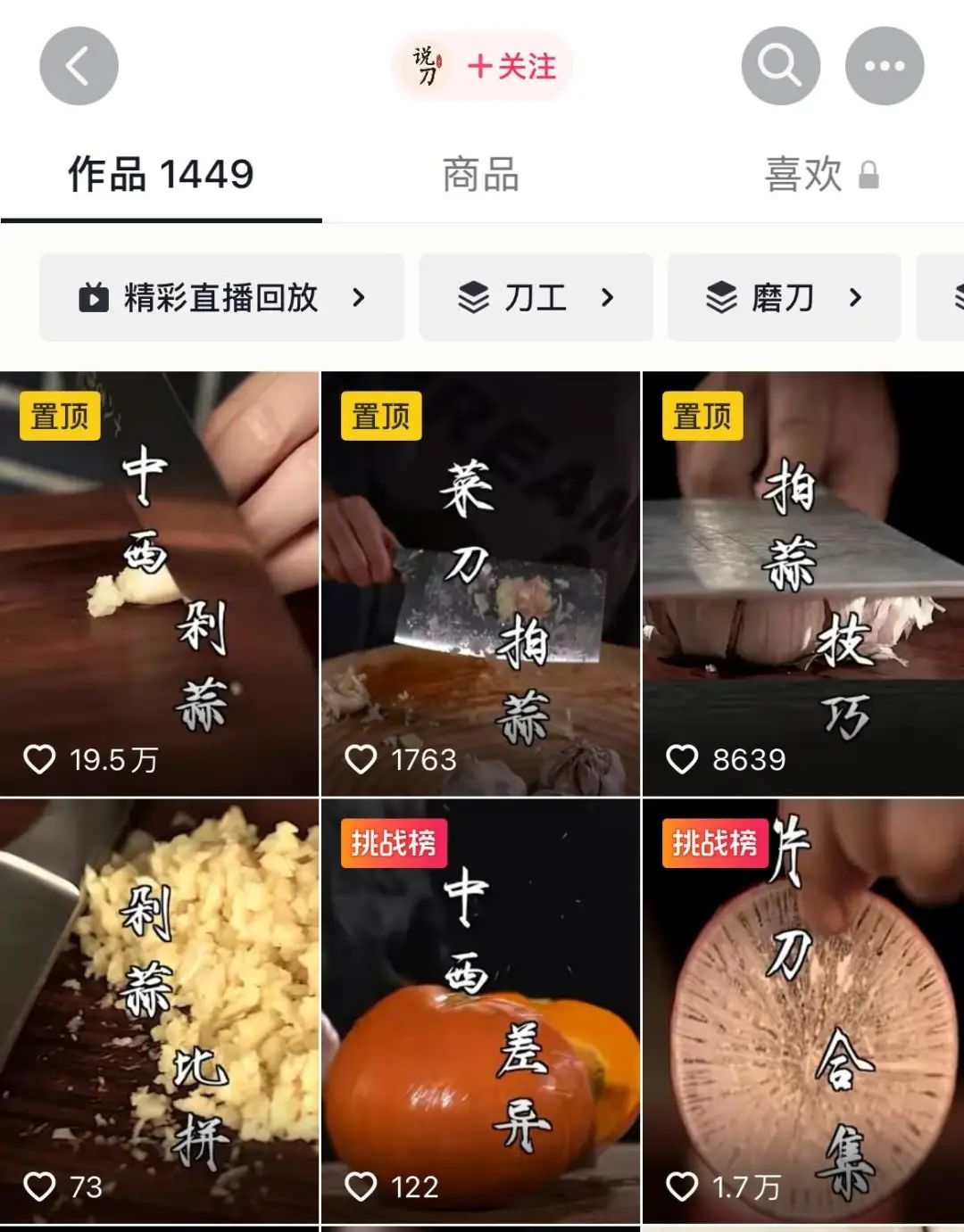 十八子作发布并置顶《拍蒜技巧》、《中西剁蒜》等创意短视频,点赞量大大高于日常发布内容。