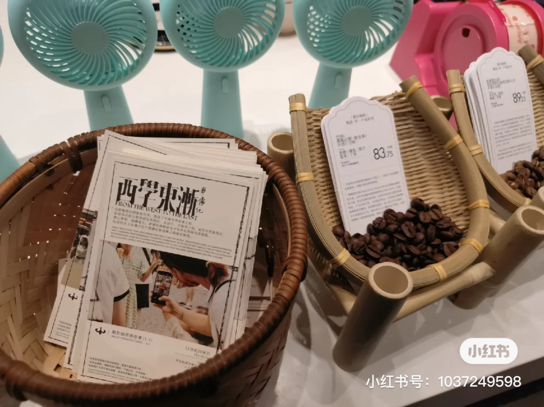 店内古风味更是拉满,字画随处可见,灯具是草帽装饰,咖啡豆用小簸箕装着。