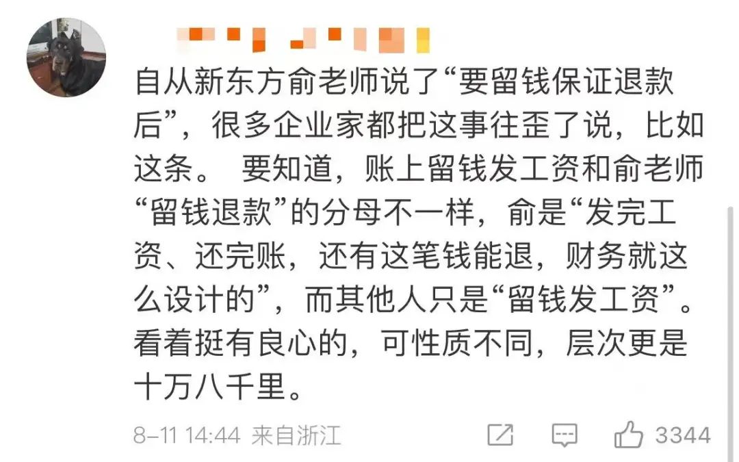 网友对此褒贬不一。有人联想到,之前俞敏洪也提到自己会在账面上留钱,假如哪一天新东方倒闭了,可以有钱支付工资,给学员退费。