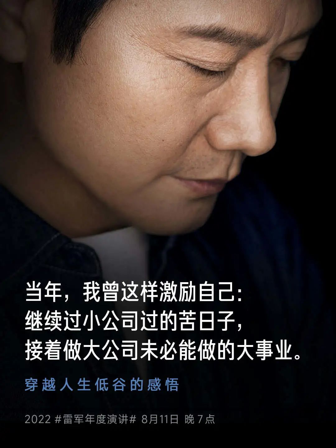 发布会的第一个小时依然是雷军的年度演讲,演讲主题是“穿越人生低谷的感悟”。这是他的第三次演讲。
