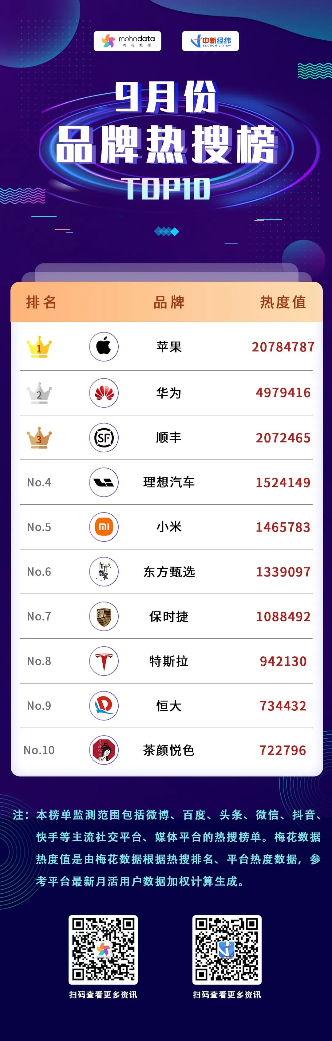 9月品牌热搜榜发布!苹果、华为、顺丰等上榜