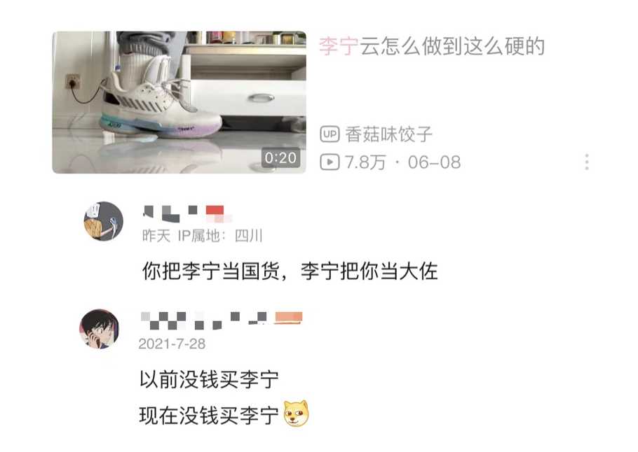 “我把李宁当国货,李宁把我当大佐”,在视频平台上搜索“李宁”二字,跳出来的除了品牌宣传内容,还有不少类似的消费者吐槽,意思是为了支持国货买了李宁,结果被品牌“背刺”了。他们有的是跑鞋质量问题,有的是收到了店铺发错的货,总之就是在产品和服务上消费者并不满意。