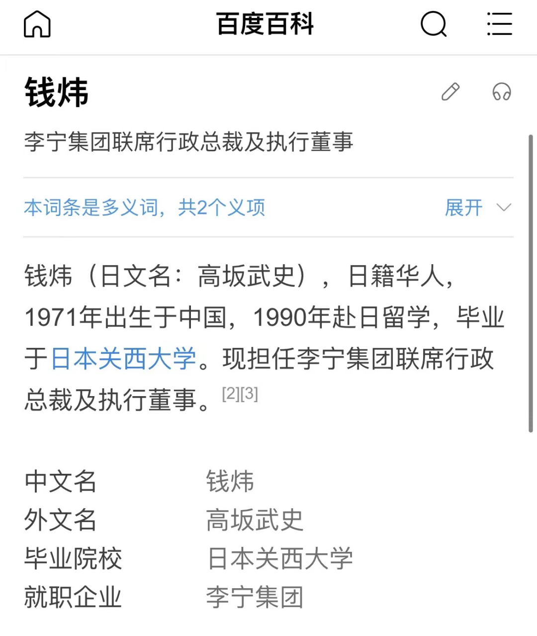与此同时,有网友发现李宁公司现在的执行董事及联席行政总裁是位日籍华人,1971年出生于中国,1990年赴日留学,毕业于日本关西大学,并且拥有自己的日本名字“高坂武史”。