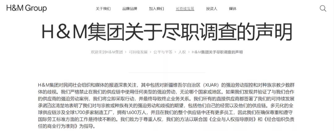 2020年7月,BCI(Better Cotton Initiative)以新疆强迫劳动为由宣称不使用新疆棉花。半年后,事件的导火索则以服装公司H&M的一则声明引起,H&M集团在其官网发布声明表示,我们不与位于新疆的任何服装制造工厂合作,也不从该地区采购产品/原材料。