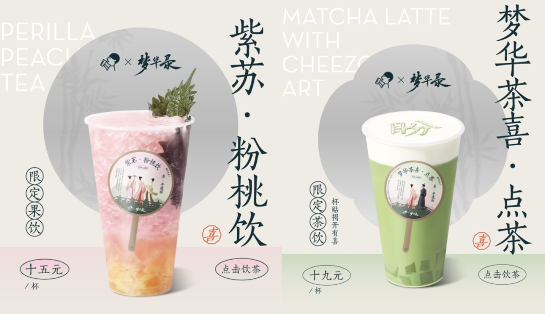 两款特制饮品——梦花茶喜·点茶和紫苏·粉桃饮,高度还原电视剧中的同款茶饮。