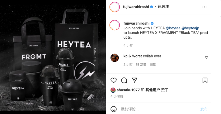 为推广特调新品“酷黑莓桑”,今年4月份,喜茶正式官宣合作街头潮流引领者藤原浩。