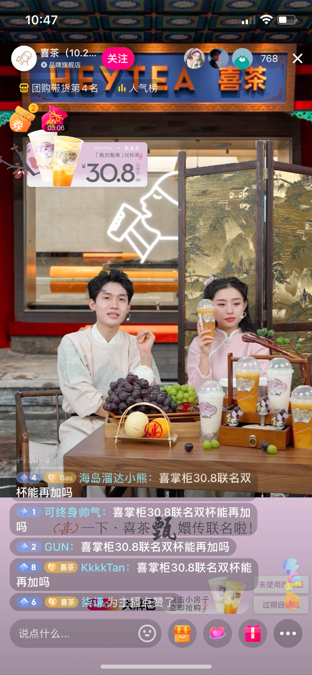 昨天联名新品上线后,喜茶的抖音直播间也被改造成了古风