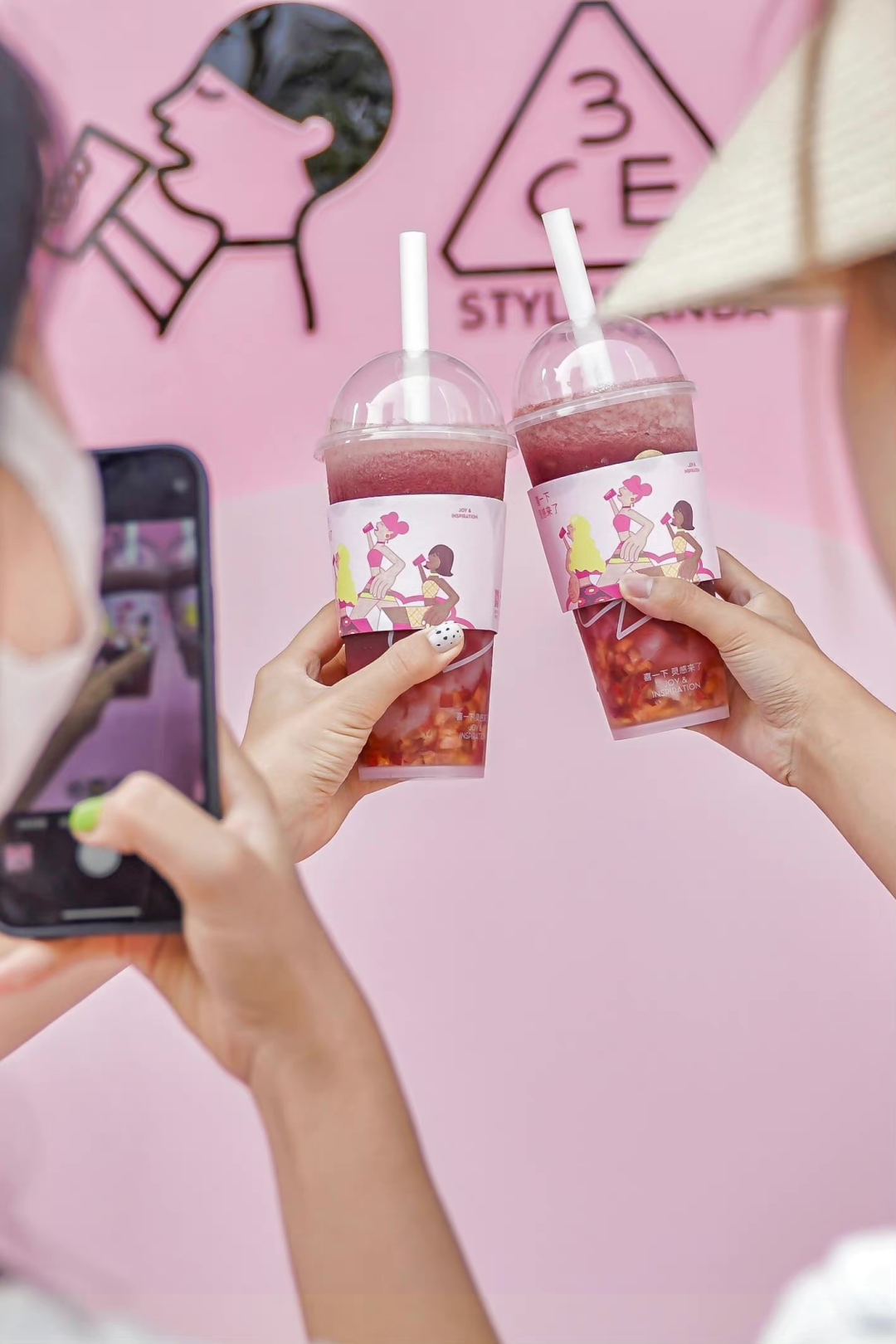 今年7月份,喜茶还与美妆品牌3CE来了波梦幻联动。