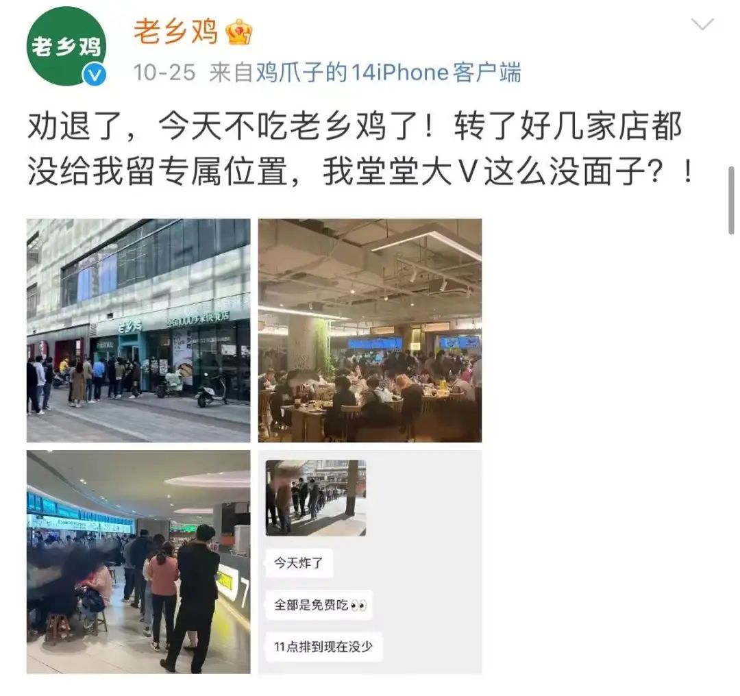 而老乡鸡官博也恢复了之前的元气,跑去招惹大V,与网友互怼,还晒照“炫耀”门店的火爆人气。