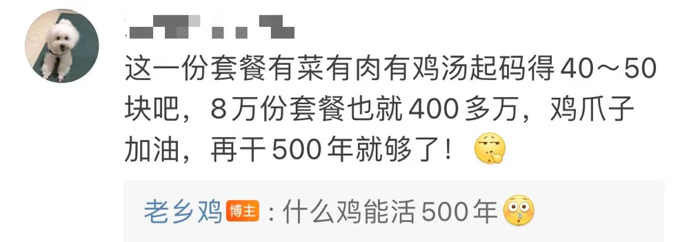 有网友给老乡鸡算了一笔账:超出的8万份套餐约等于400多万元,鸡爪子(官博昵称)再干500年就够了!