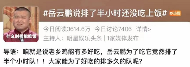 不得不说,岳云鹏与老乡鸡的气质相当契合。今年3月份,岳云鹏更主动造梗,称在老乡鸡排队半小时吃不上饭。
