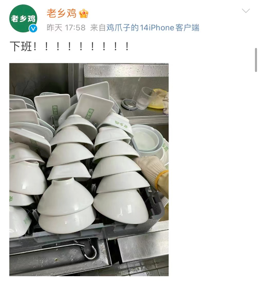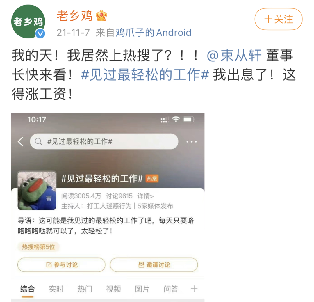 如此糊弄式地工作也一度引发热议,在#见过最轻松的工作#话题下,老乡鸡荣登榜首,成为网友的羡慕对象。
