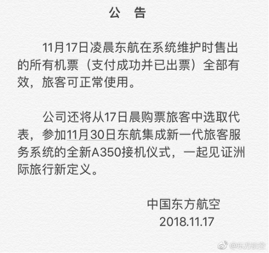 正当大家纷纷猜测东方航空会以什么借口来解释这次系统BUG,并让BUG期间所售的机票失效的时候,东方航空官方发出公告:BUG期间所售出的白菜价机票全部有效!