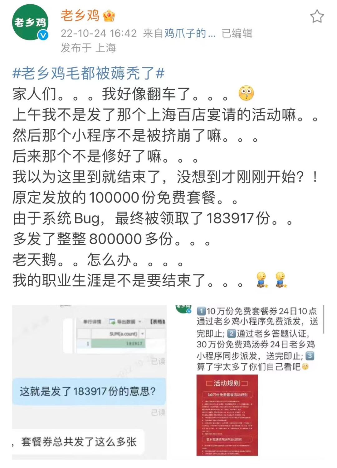 事情发生在24日,老乡鸡为庆祝“上海突破百店”,发放了10万份免费午餐,不想抢券人数过多,导致小程序崩溃,免费午餐券被领取了18万份之多……