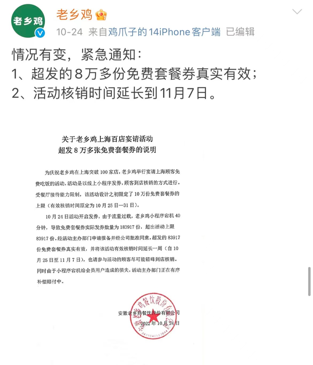 正当网友以为品牌的道歉公关即将再次上演……事件发生的四小时后,老乡鸡官博发布盖章说明,通知网友超发的免费套餐券真实有效,并且将活动核销时间延长到11月7日。