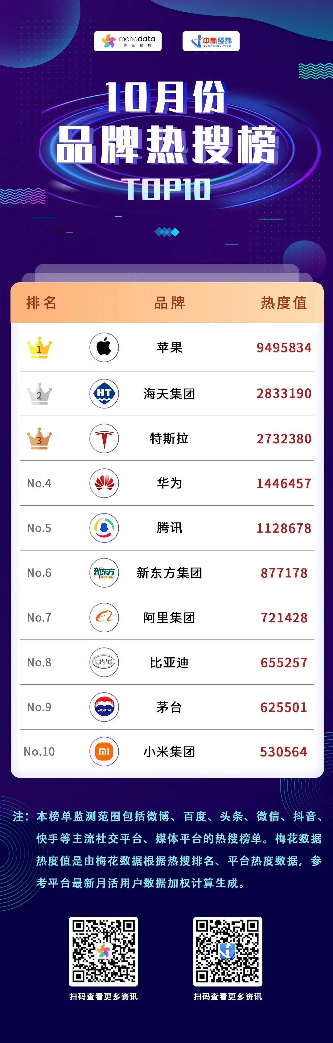 10月品牌热搜榜发布!苹果、海天、特斯拉等上榜
