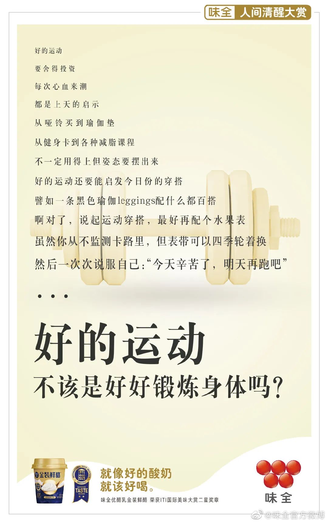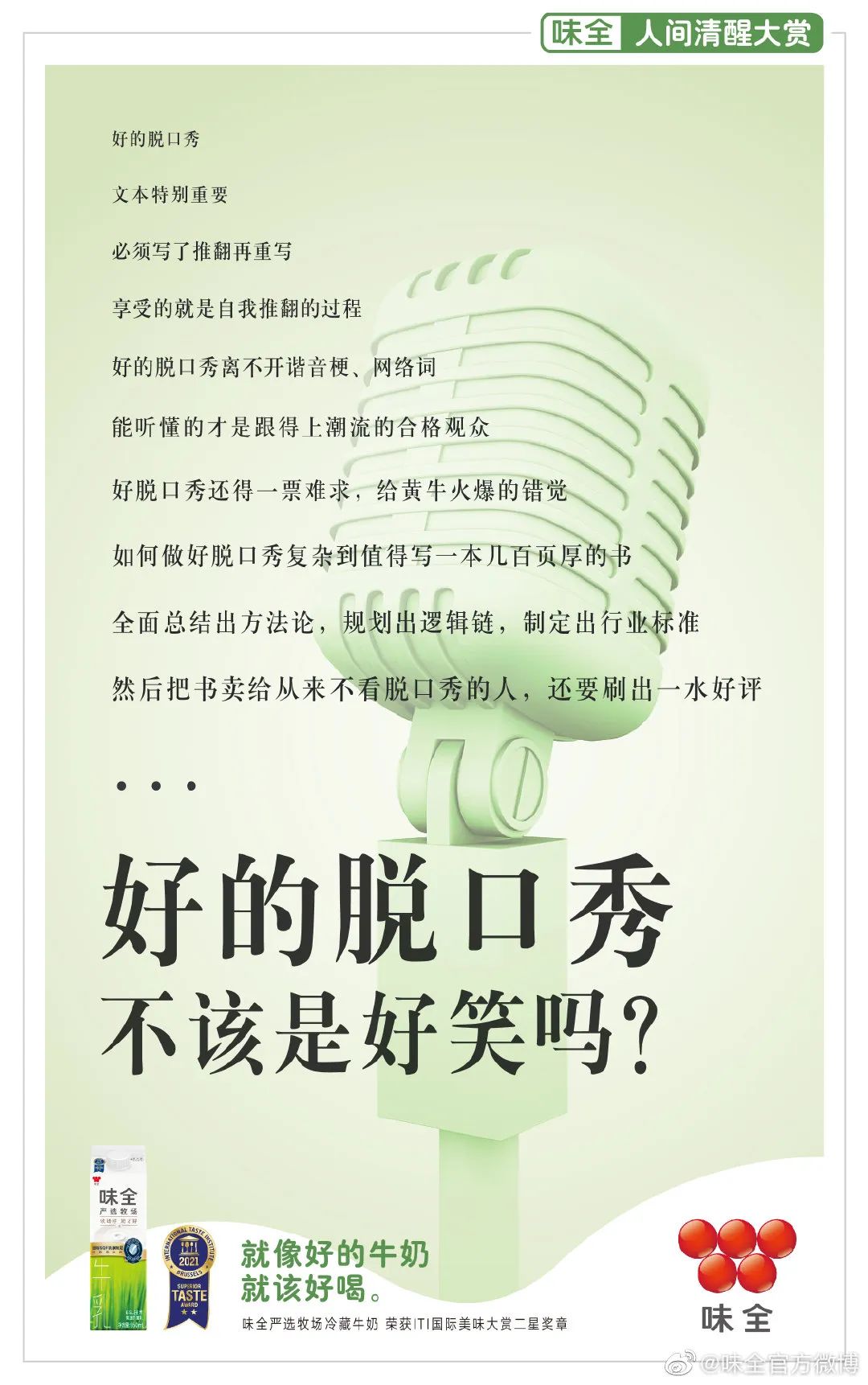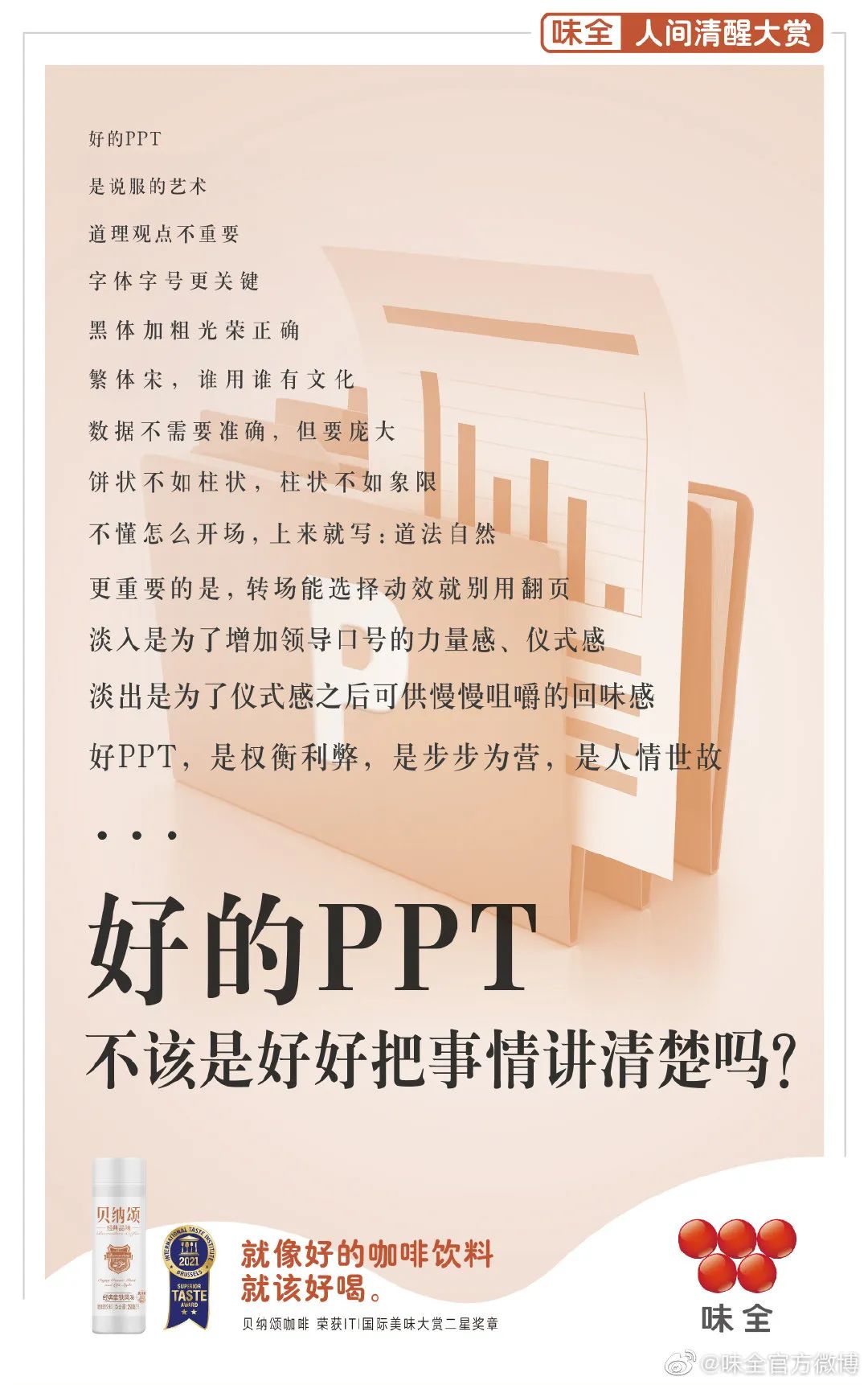 11月2日,味全官博发布了“人间清醒大赏”系列海报,用长文案吐槽促销、前任、Tony老师、脱口秀……甚至吐槽了PPT和广告。