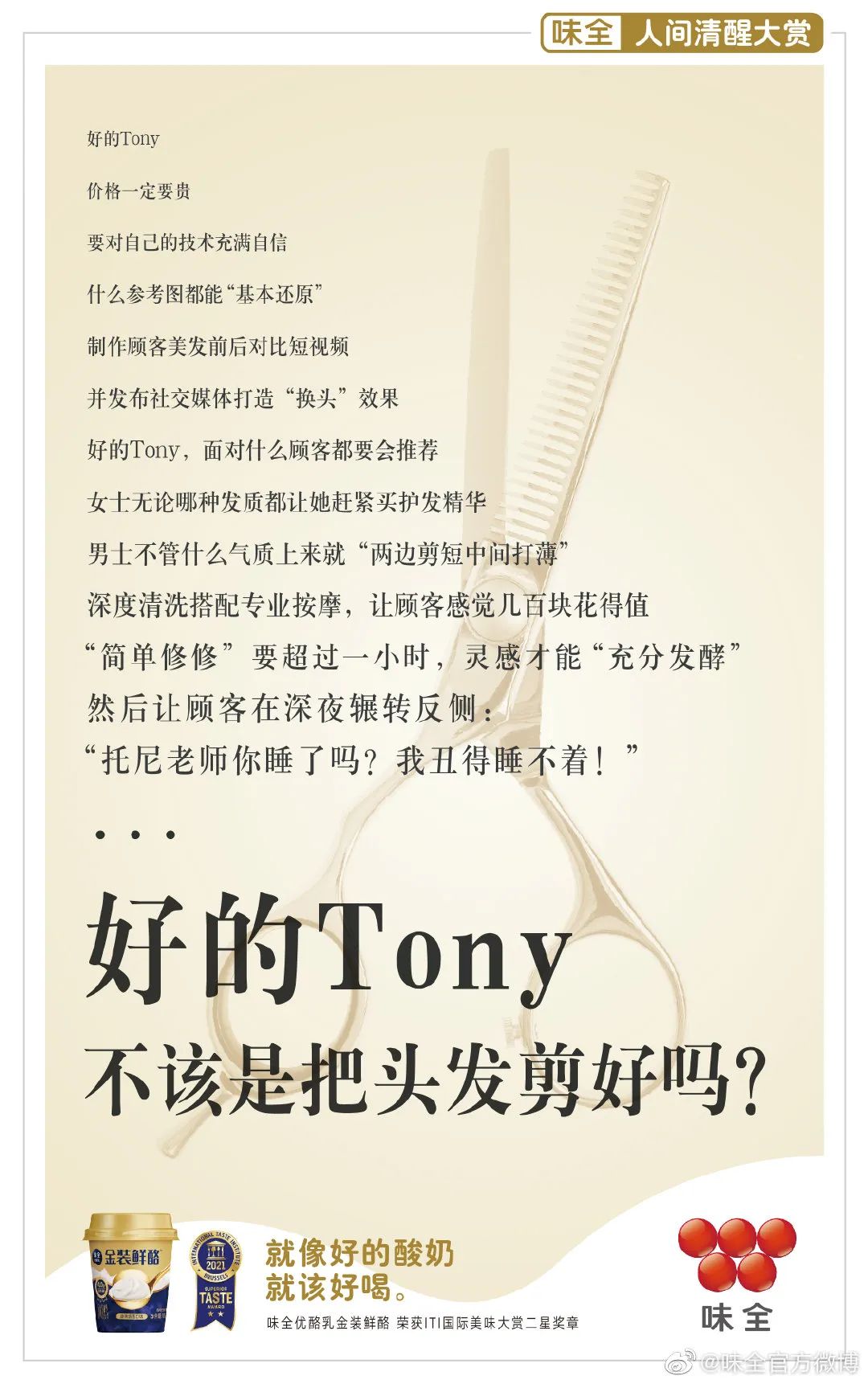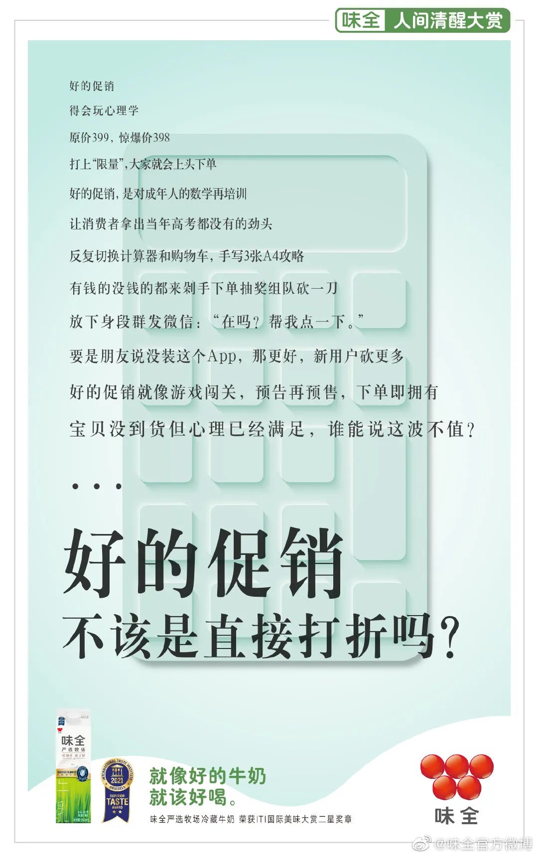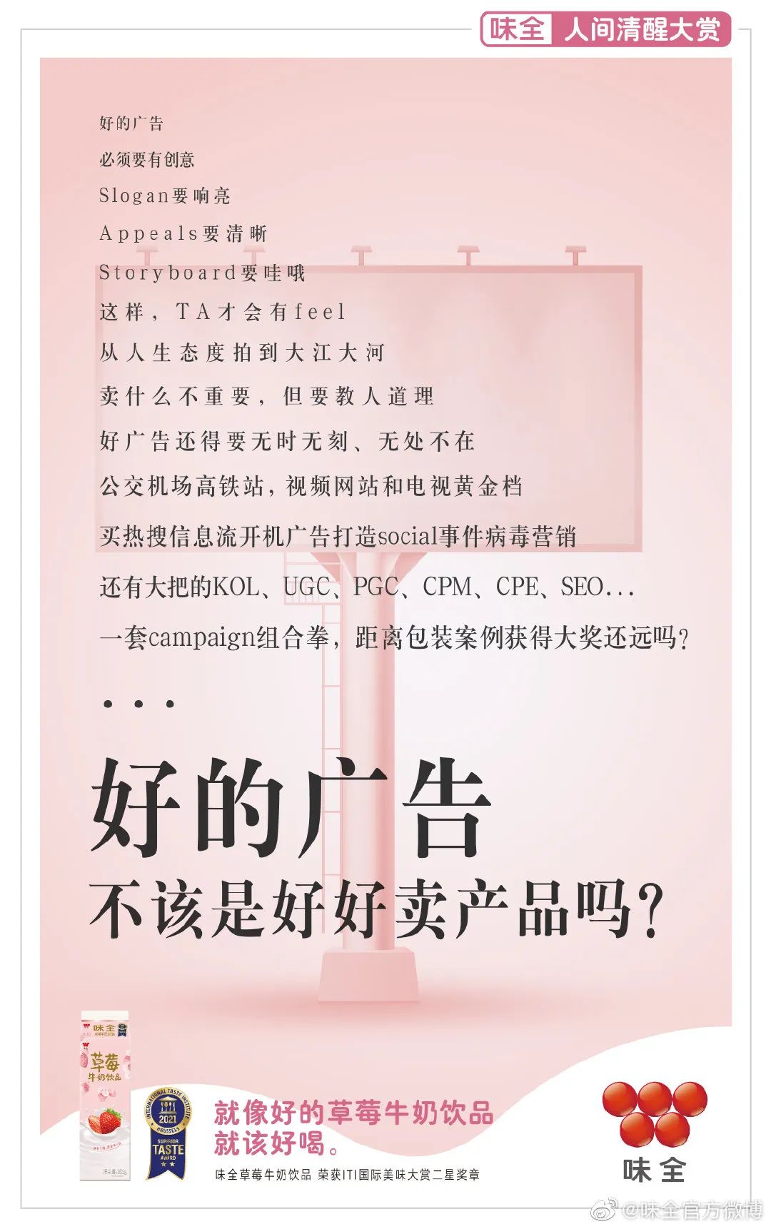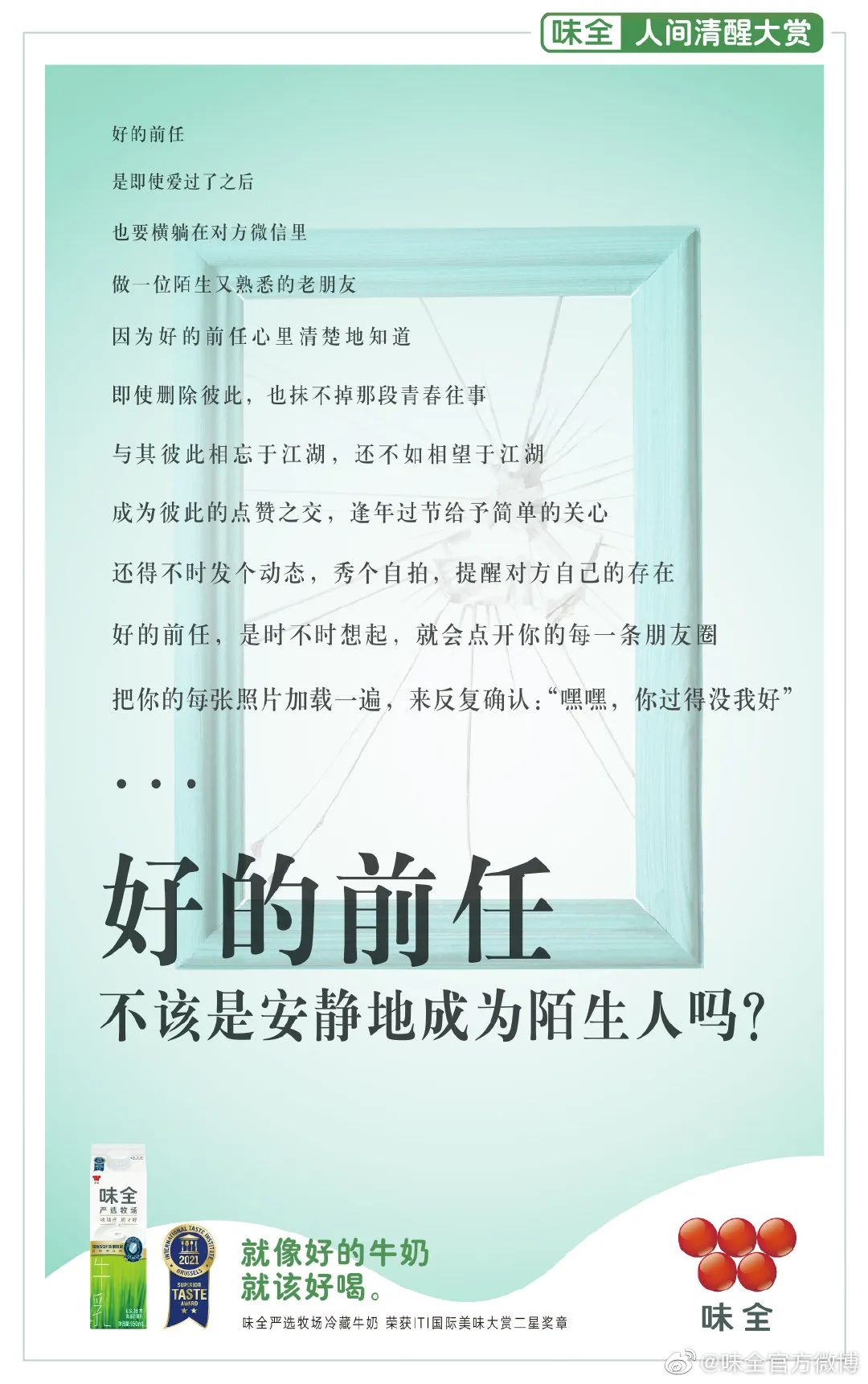 11月2日,味全官博发布了“人间清醒大赏”系列海报,用长文案吐槽促销、前任、Tony老师、脱口秀……甚至吐槽了PPT和广告。