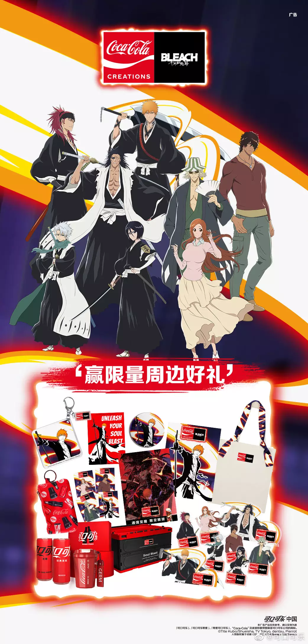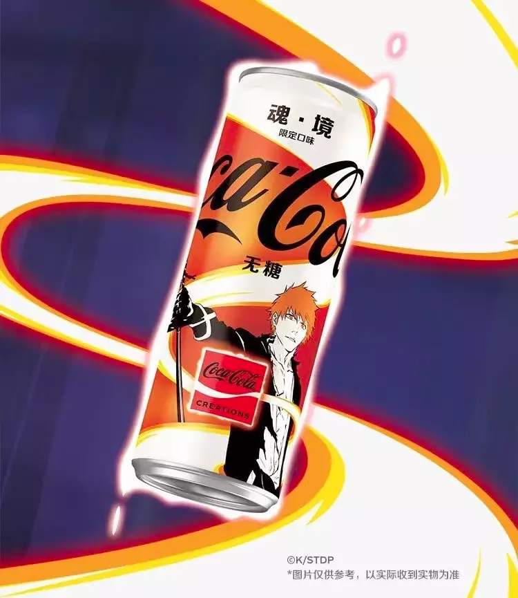 今年10月,动画《死神BLEACH》时隔十年上线最终章《千年血战》,可口可乐借此推出联名限定新品“可口可乐魂·境可乐型汽水”,并设计了冰箱贴、笔记本等多款动漫周边。该产品在日本地区同步上市。