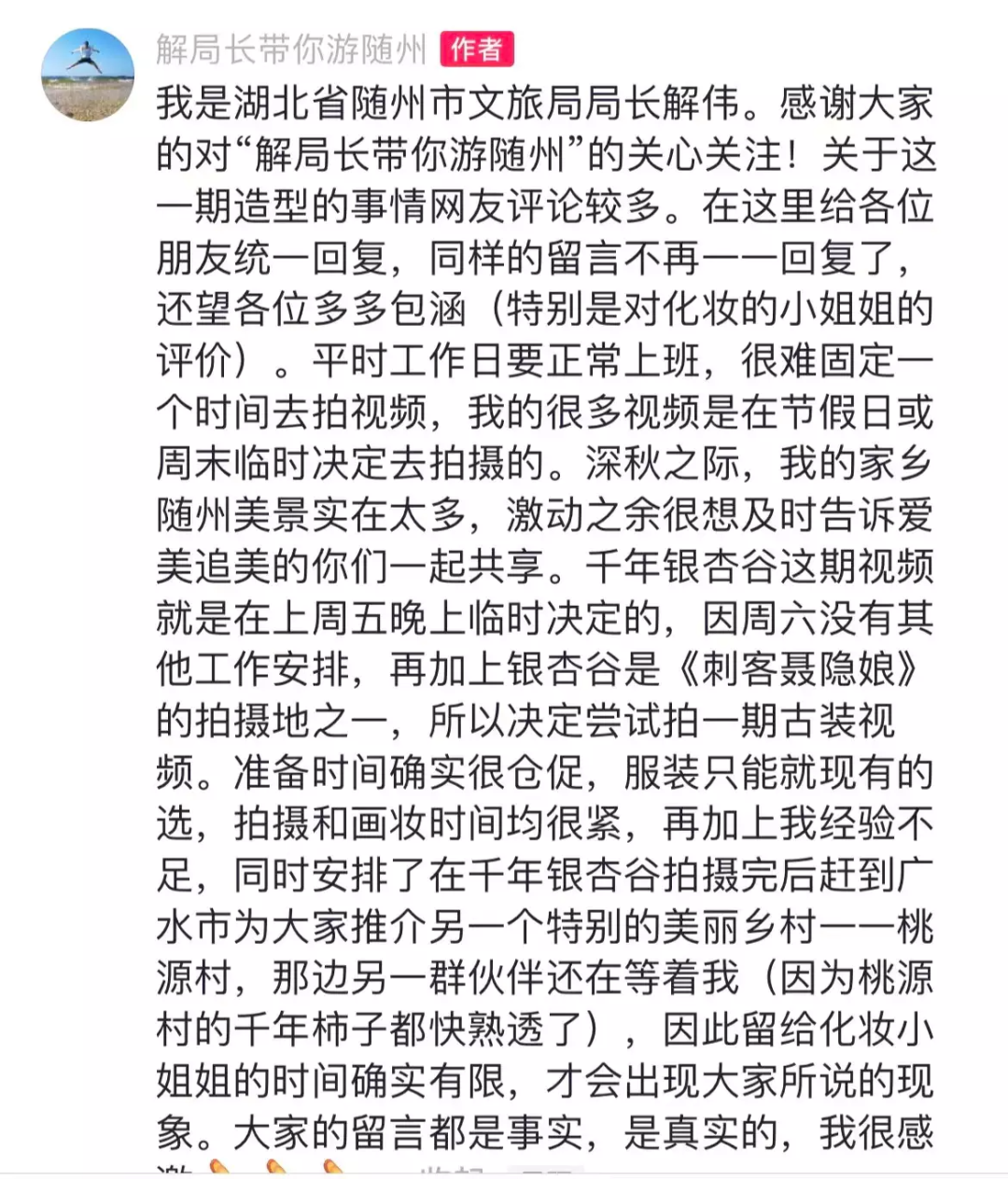 很快,湖北随州文旅局局长解伟出面回应,称视频中的男主角就是自己。