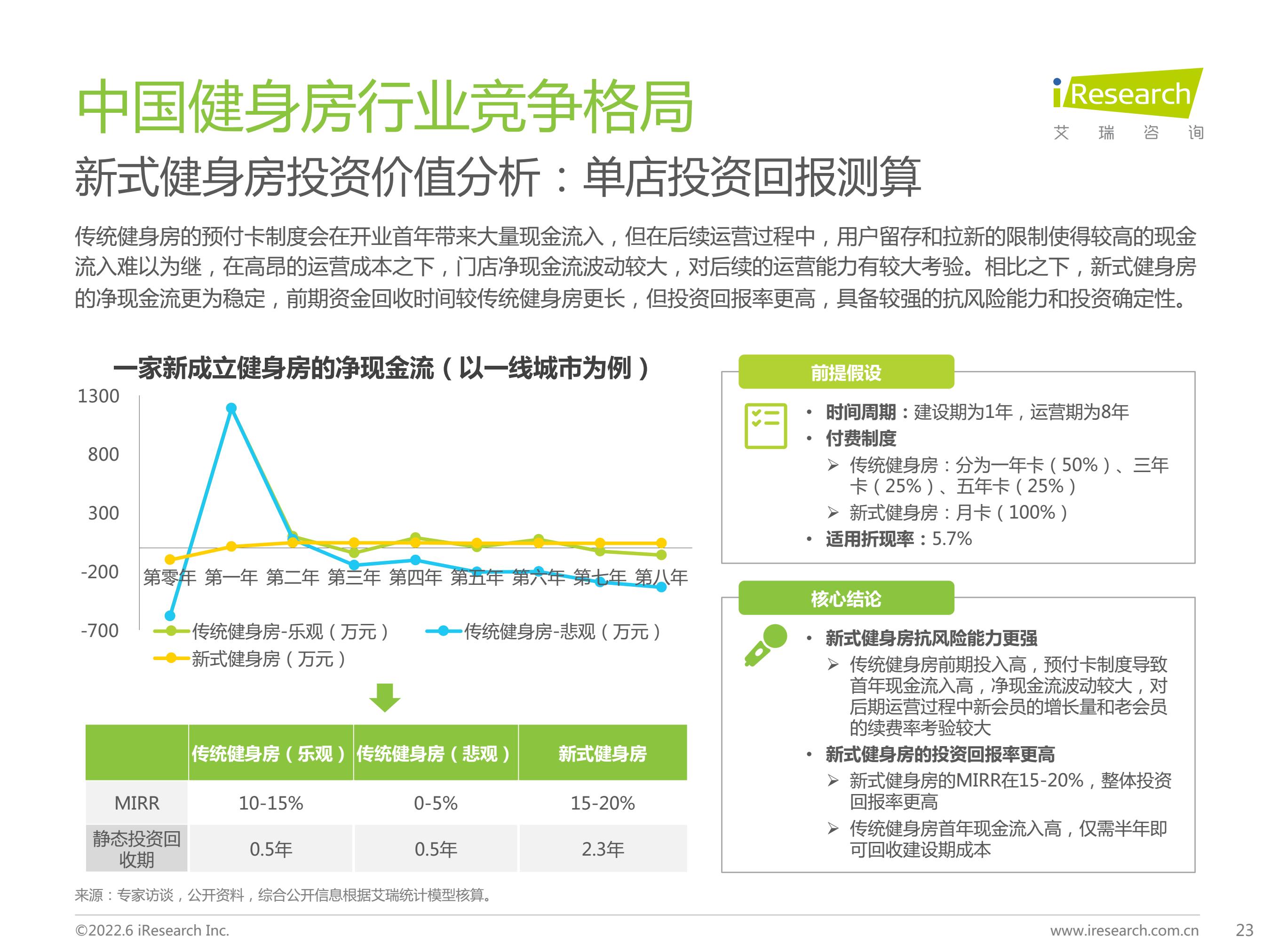竞争格局:健身房行业区域化特征较强,市场格局分散。新式玩家相对轻量化的运营模式使其具备更强的盈利能力和抗风险能力;传统玩家通过大店模式提供全面优质的服务,门店坪效较高,并通过调整收费模式与运营模式等持续谋求转型,优化盈利模型。