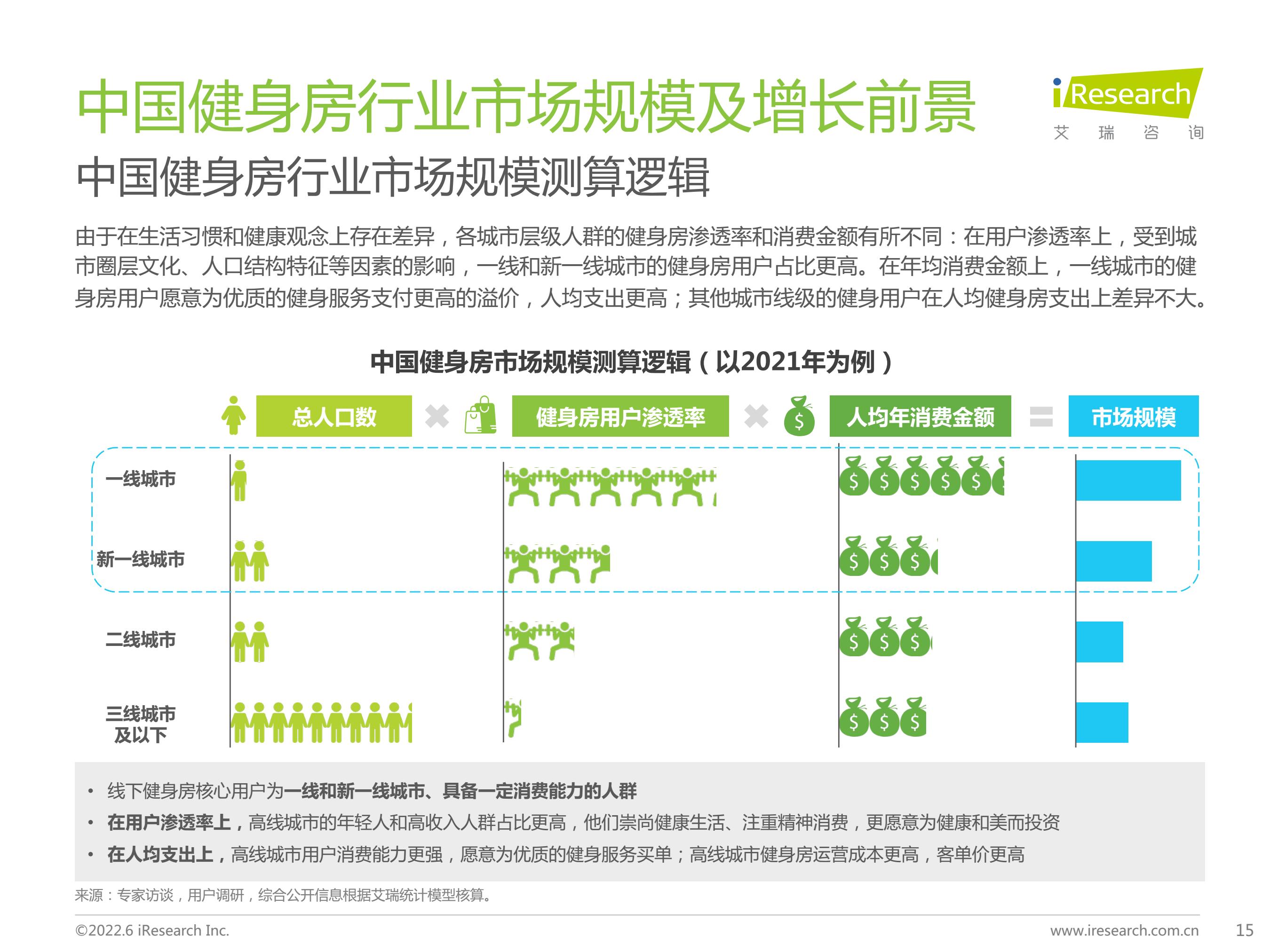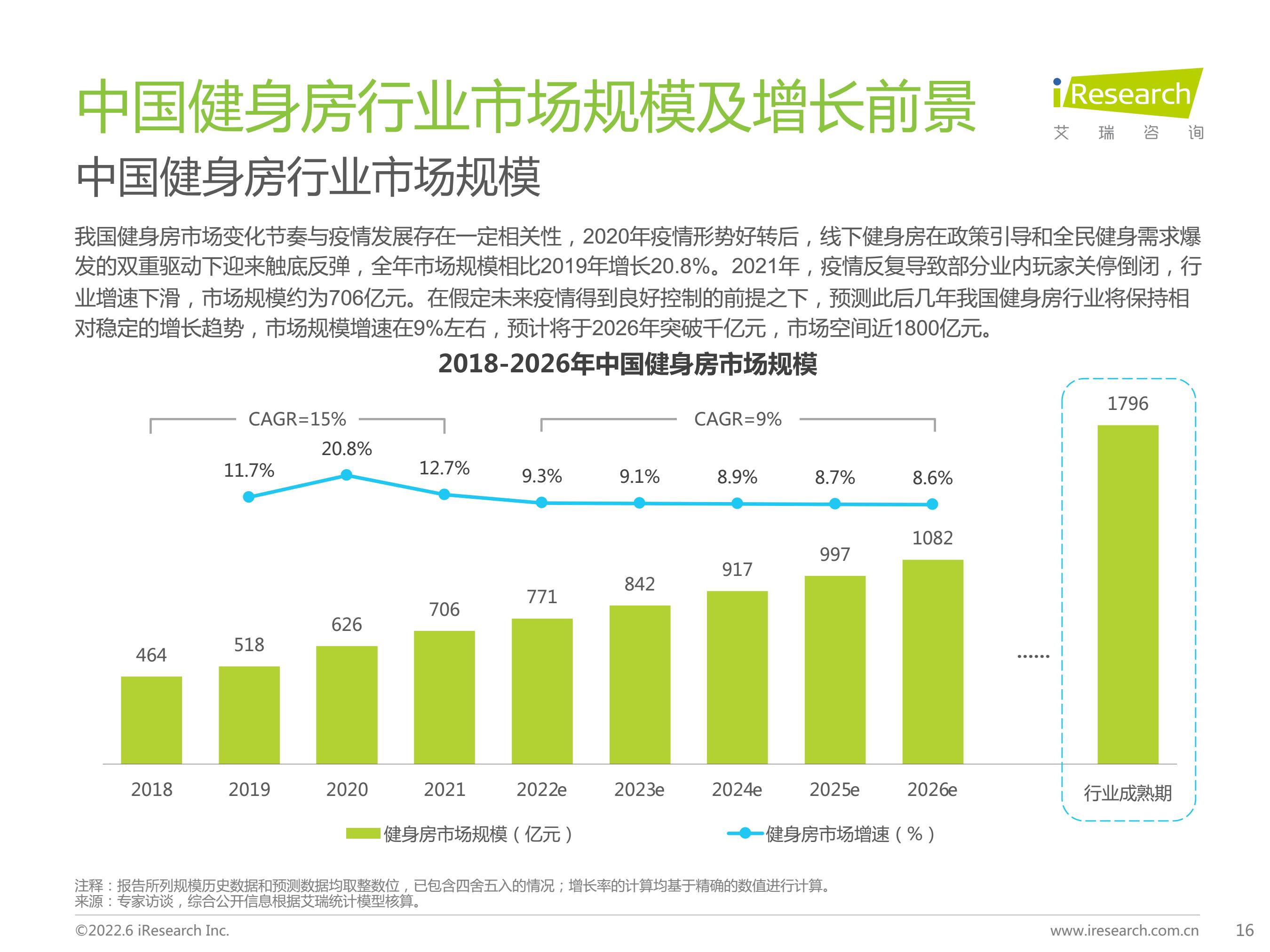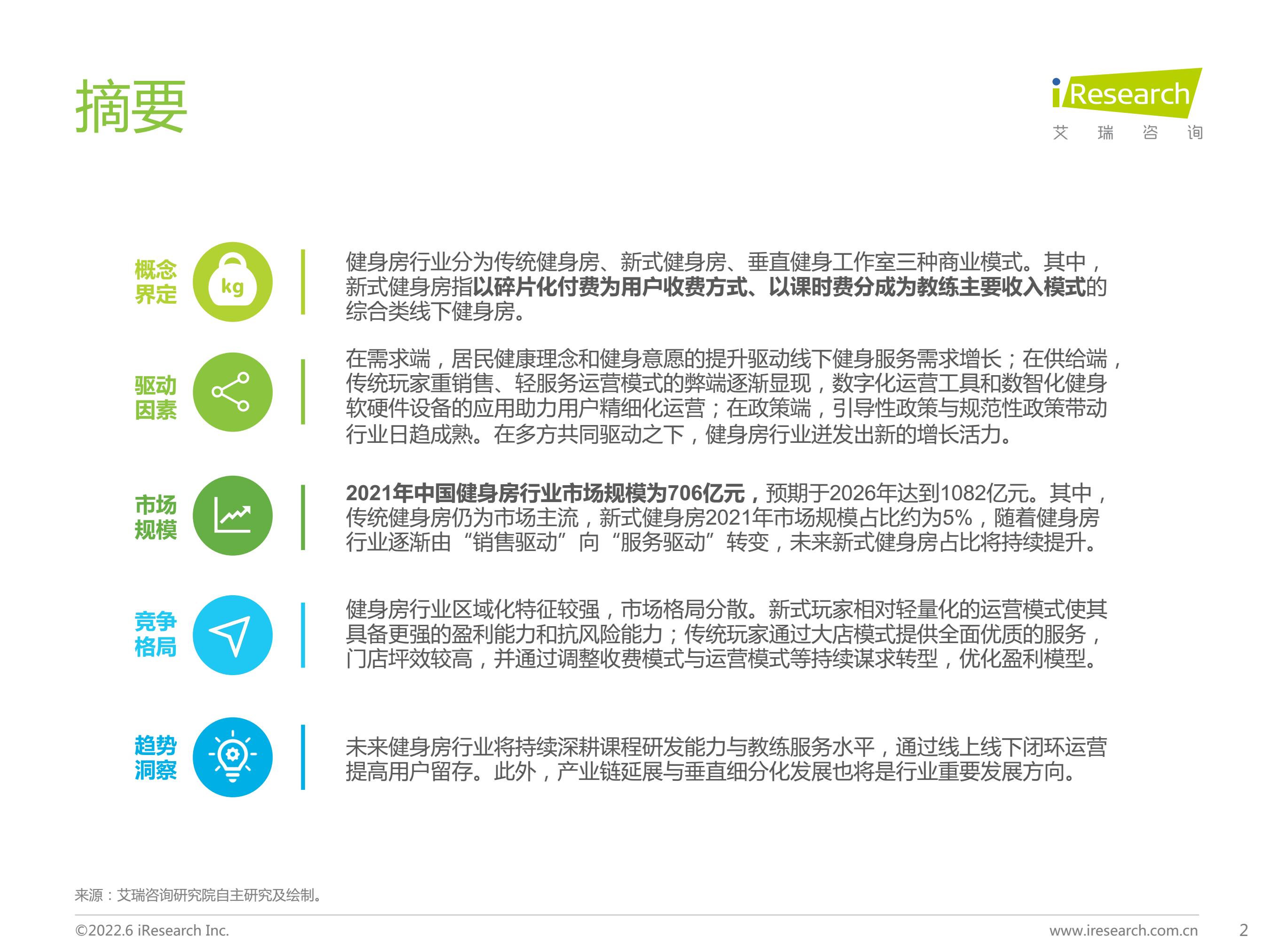 2021年中国健身房行业市场规模为706亿元,预期于2026年达到1082亿元。其中,传统健身房仍为市场主流,新式健身房2021年市场规模占比约为5%,随着健身房行业逐渐由“销售驱动”向“服务驱动”转变,未来新式健身房占比将持续提升。