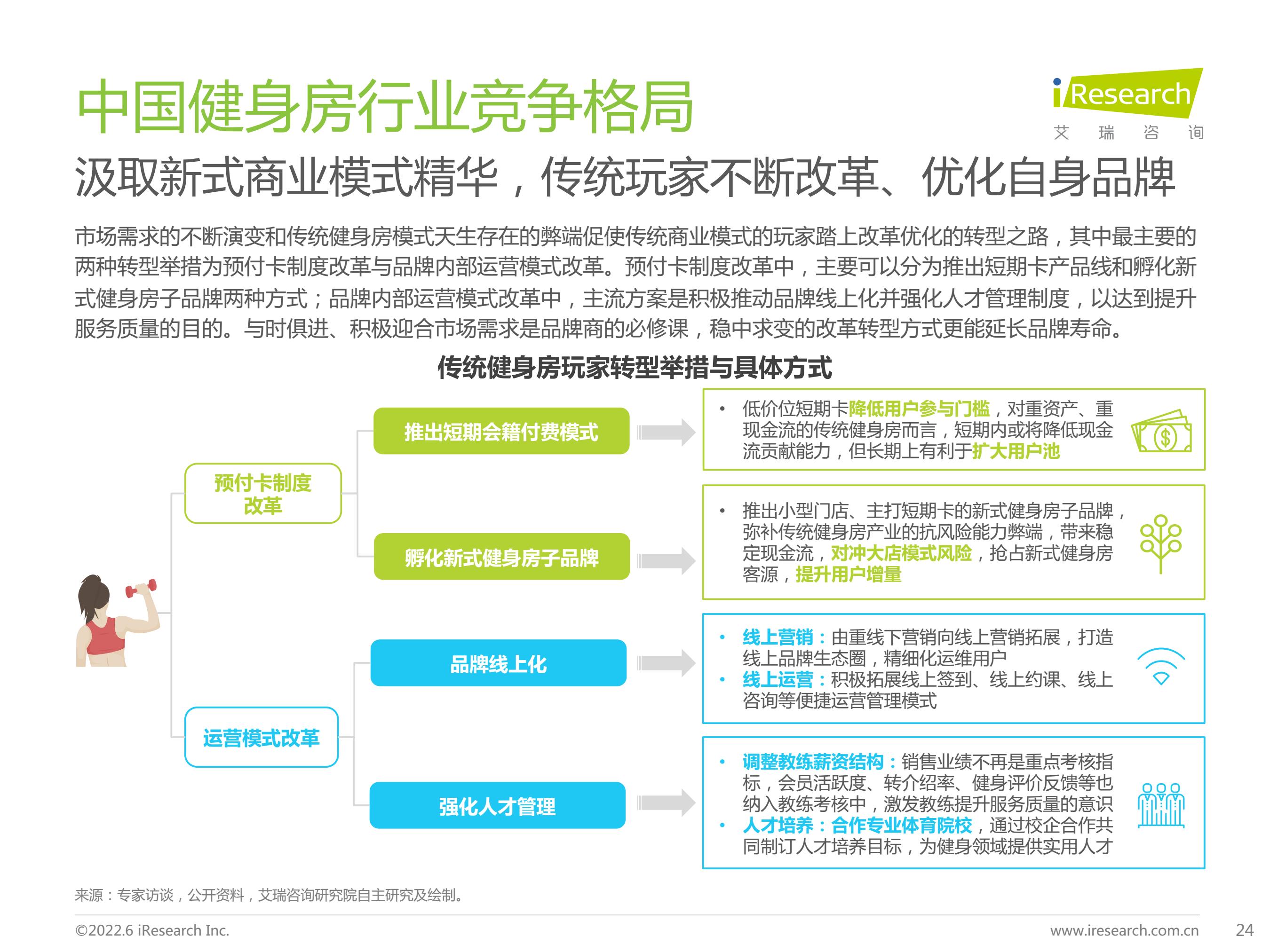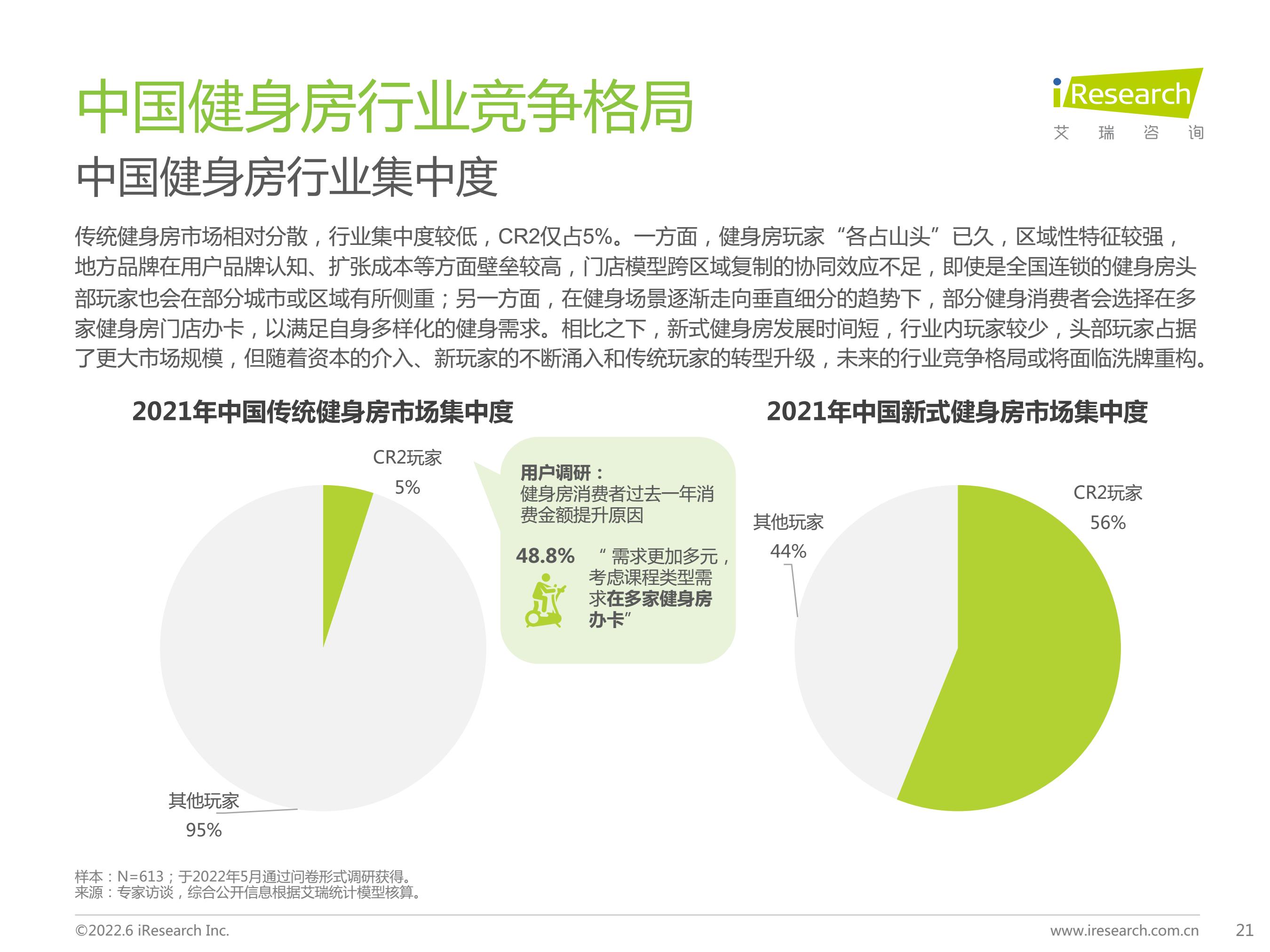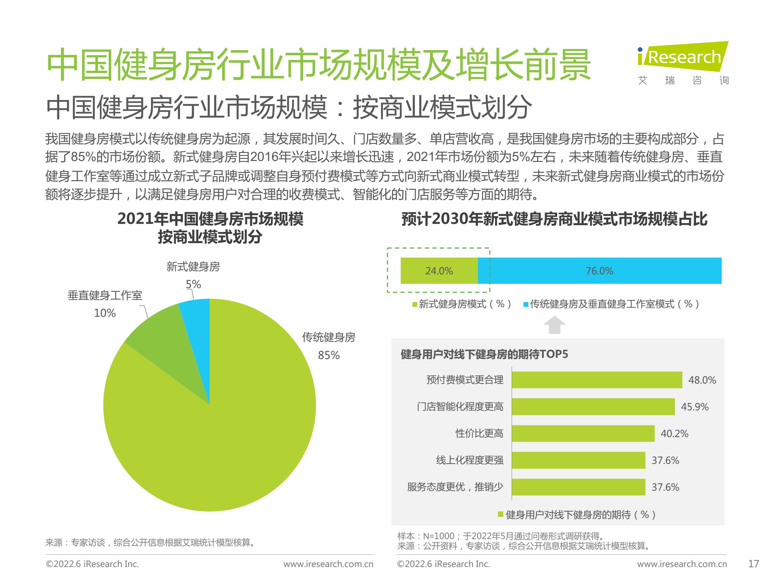 2021年中国健身房行业市场规模为706亿元,预期于2026年达到1082亿元。其中,传统健身房仍为市场主流,新式健身房2021年市场规模占比约为5%,随着健身房行业逐渐由“销售驱动”向“服务驱动”转变,未来新式健身房占比将持续提升。