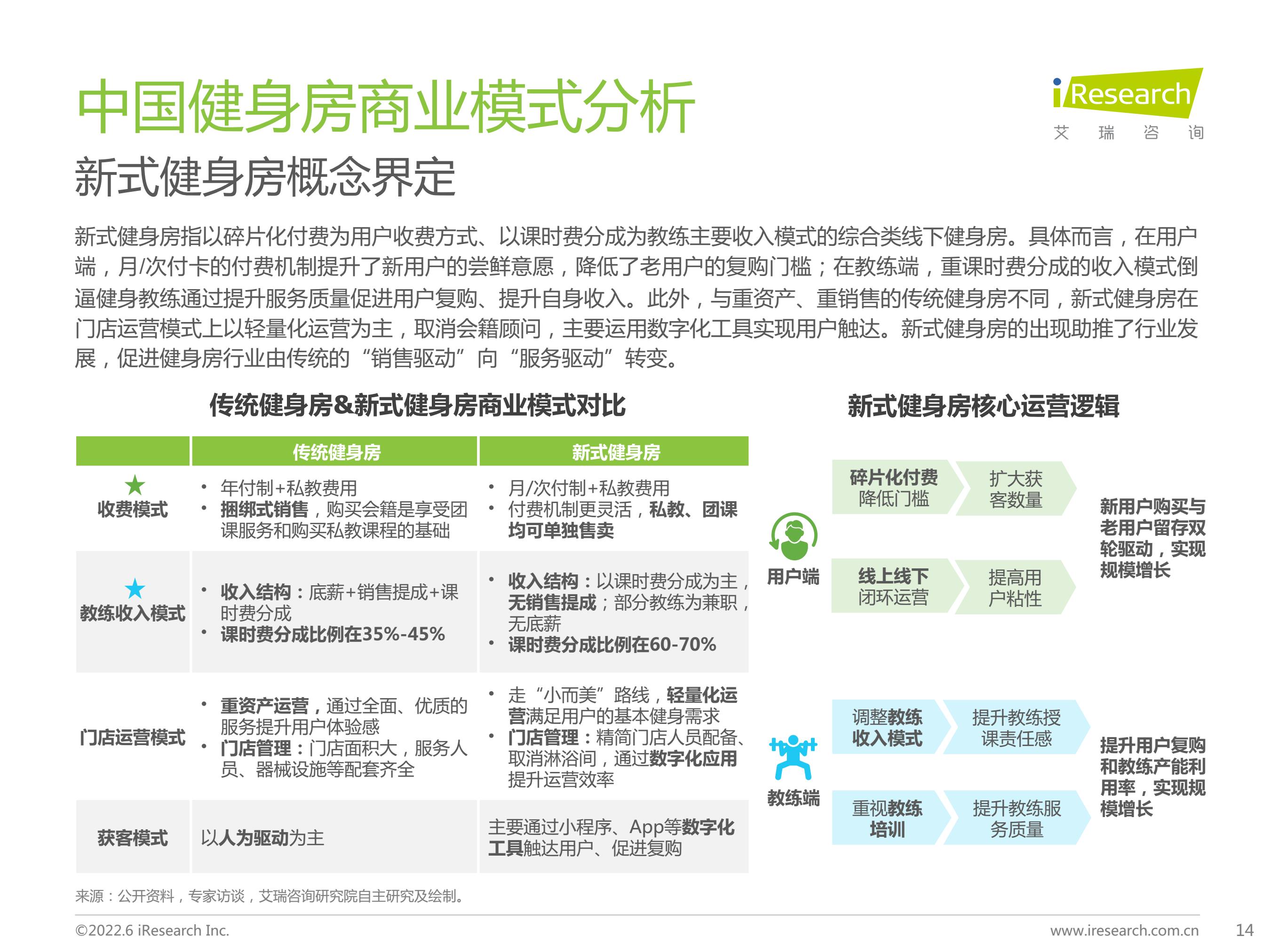概念界定:健身房行业分为传统健身房、新式健身房、垂直健身工作室三种商业模式。其中,新式健身房指以碎片化付费为用户收费方式、以课时费分成为教练主要收入模式的综合类线下健身房。