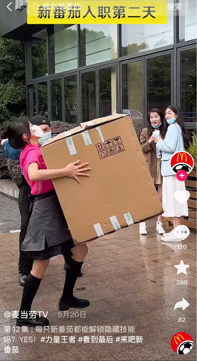 官方整活,粉红小姐姐一把抱起小哥都抬不起来的纸箱
