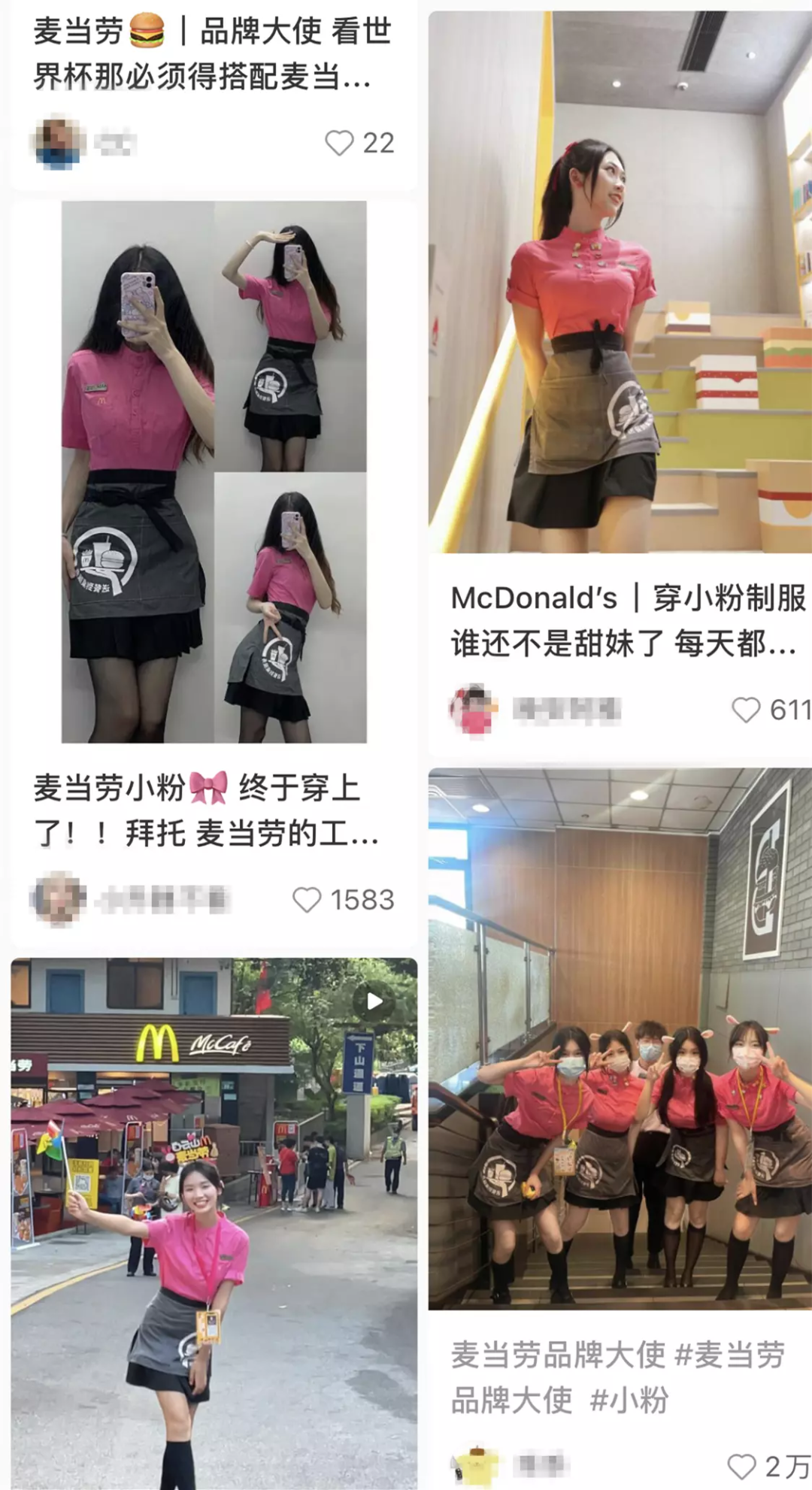图片里,她们一个个身材高挑、颜值赛高,身穿粉色衬衫+黑色短裙+黑色丝袜的统一着装,上演“制服诱惑”,引得路人纷纷拍照。在小红书上,网友们亲切地称呼她们“小粉”。更有人直言,麦当劳的“小粉”,一下就占据了心巴,甚至打败了隔壁的疯狂星期四