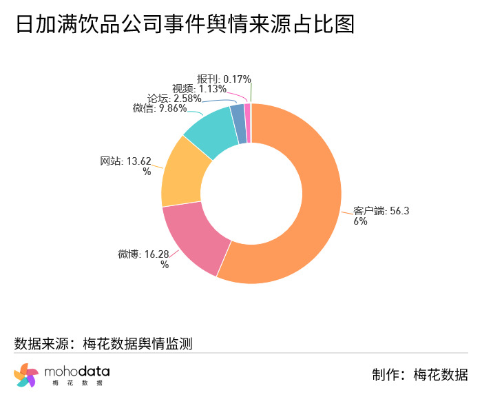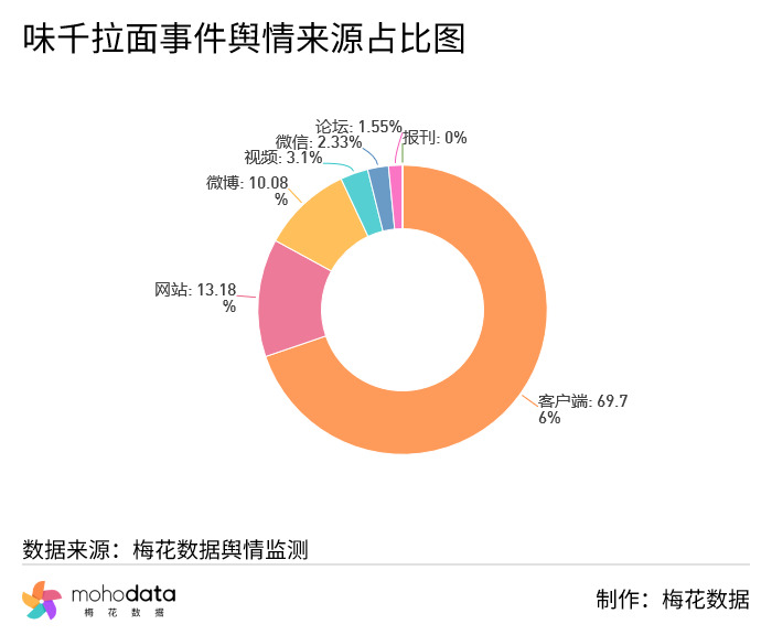 其中信息来源分布图如下图所示,声量主要集中在客户端,客户端占比69.76%,网站占比13.18%,微博占比10.08%,其他信息来源占比不超过10%。