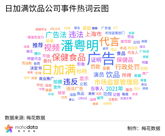 声量热词方面,热词云图如下所示,其中“潘粤明”“代言”“保健食品”“视频”“违法”“违反”“饮品”“广告法”“行政处罚”等词汇排名较前。