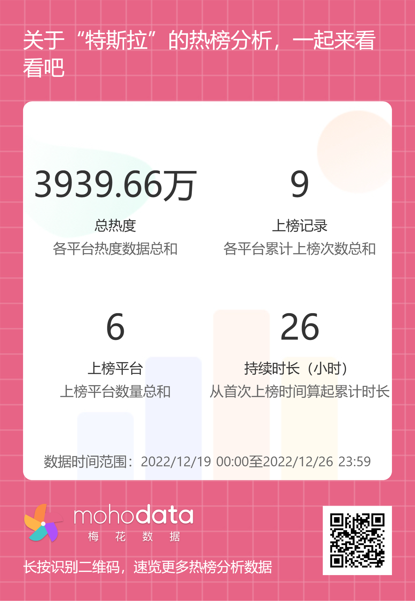 热搜方面,特斯拉事件相关热搜热度总计3939.66万,上榜记录9次,上榜平台6家,持续时长26小时。详情可扫描以下二维码查看。