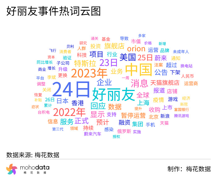 声量热词方面,热词云图如下所示,其中“24日”“中国”“2023年”“2022年”“回应”“项目”“旗舰店”等词汇排名较前。