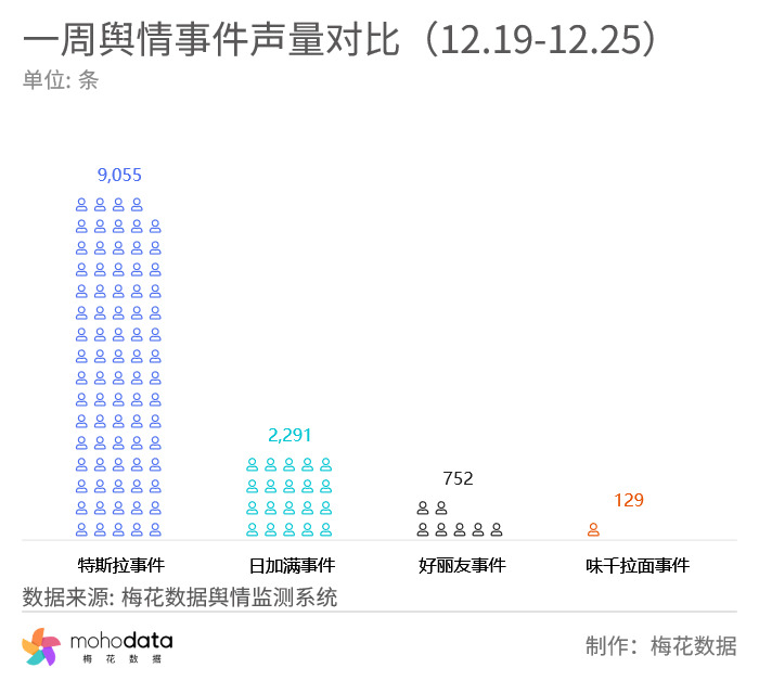 舆情声量方面,上周的主要负面舆情当中,“特斯拉事件”声量最高,监测期间共监测到舆情声量9055条,其次 “日加满事件”舆情声量为2291条,“好丽友事件”舆情声量为752条,“味千拉面事件”舆情声量为129条。