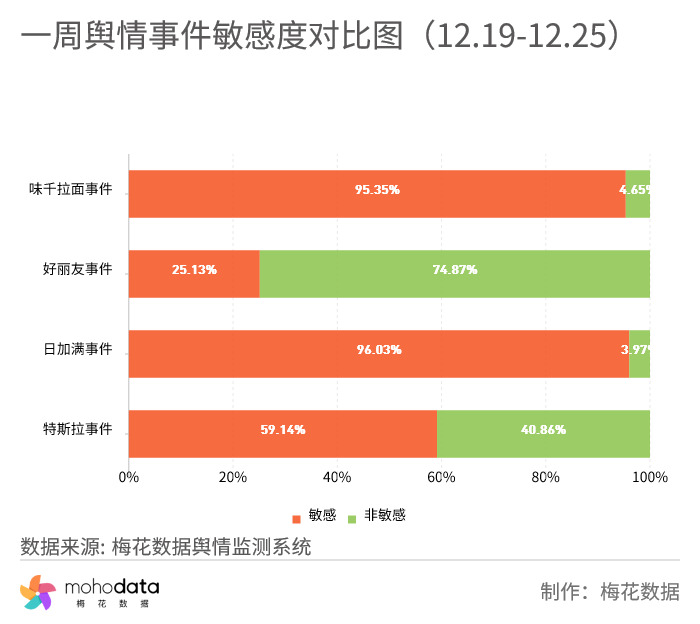 敏感度方面,“日加满事件”相关的敏感度最高,占比达96.03%。“味千拉面事件”占比达95.35%, “特斯拉事件”占比达59.14%,“好丽友事件”占比达25.13%。