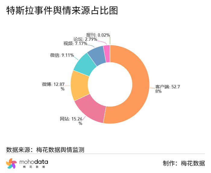 其中信息来源分布图如下所示,声量主要集中在客户端,客户端占比52.78%,网站占比15.26%,微博占比12.87%,其他信息来源占比不超过10%。