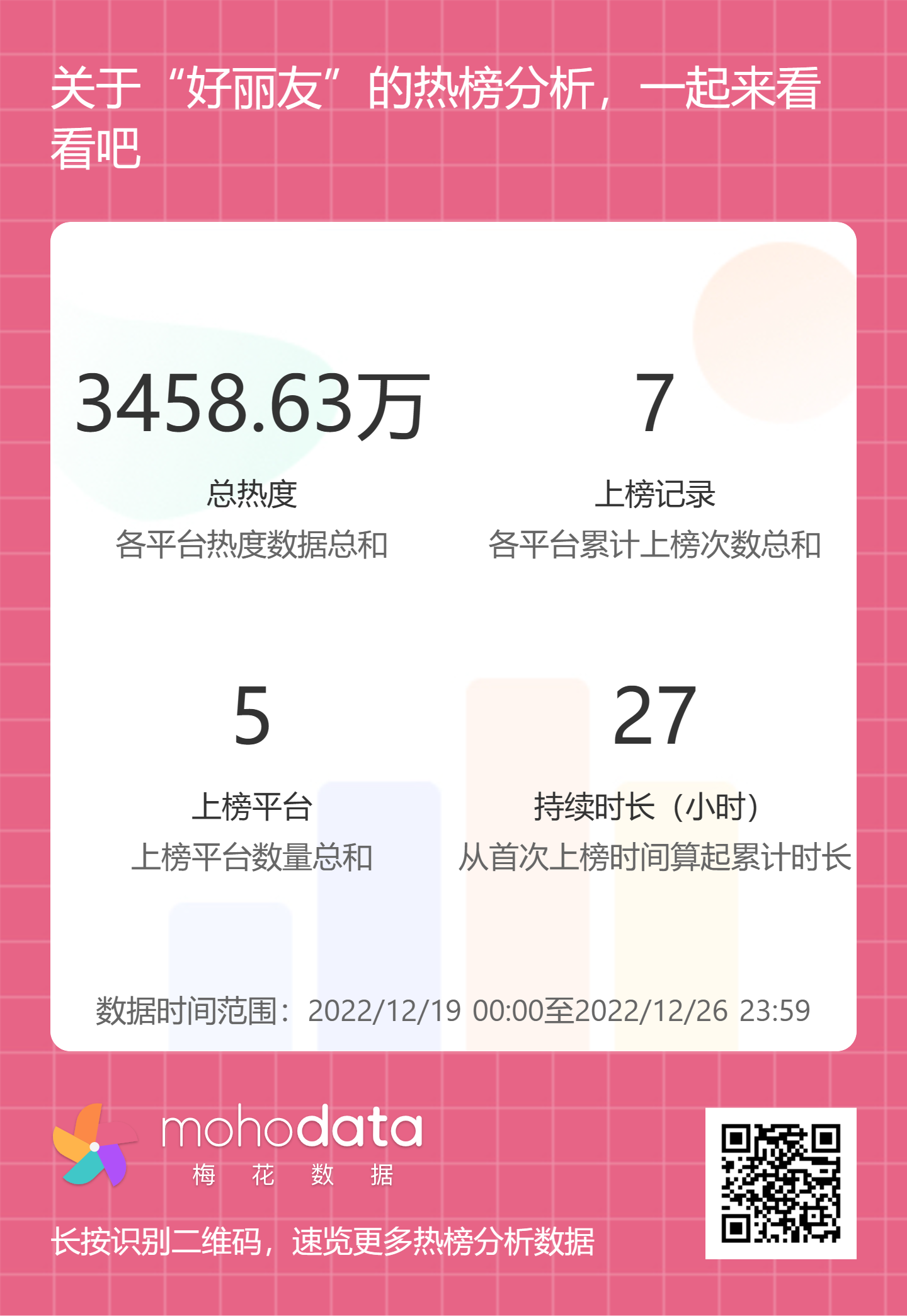 热搜方面,好丽友事件相关热搜热度总计3458.63万,上榜记录7次,上榜平台5家,持续时长27小时。详情可扫描以下二维码查看。