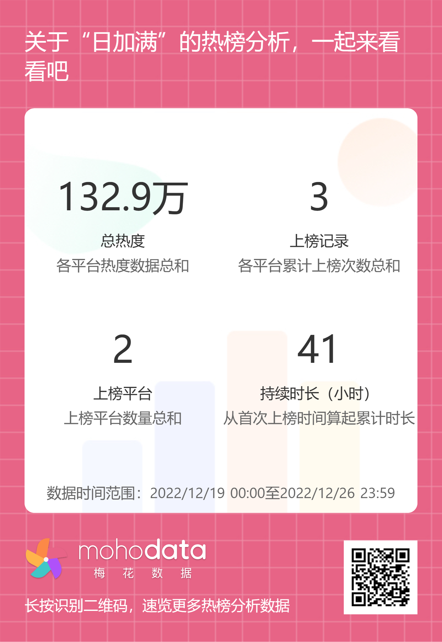 热搜方面,日加满事件相关热搜热度总计132.9万,上榜记录3次,上榜平台2家,持续时长41小时。详情可扫描以下二维码查看。
