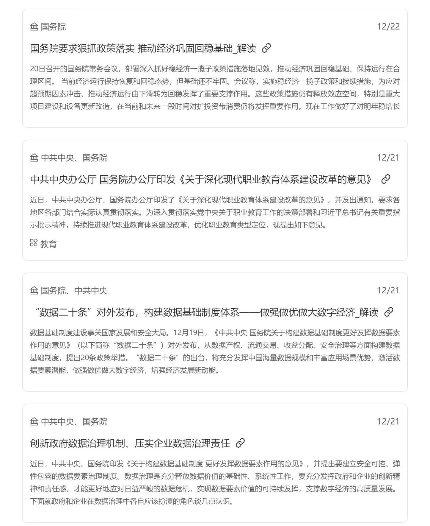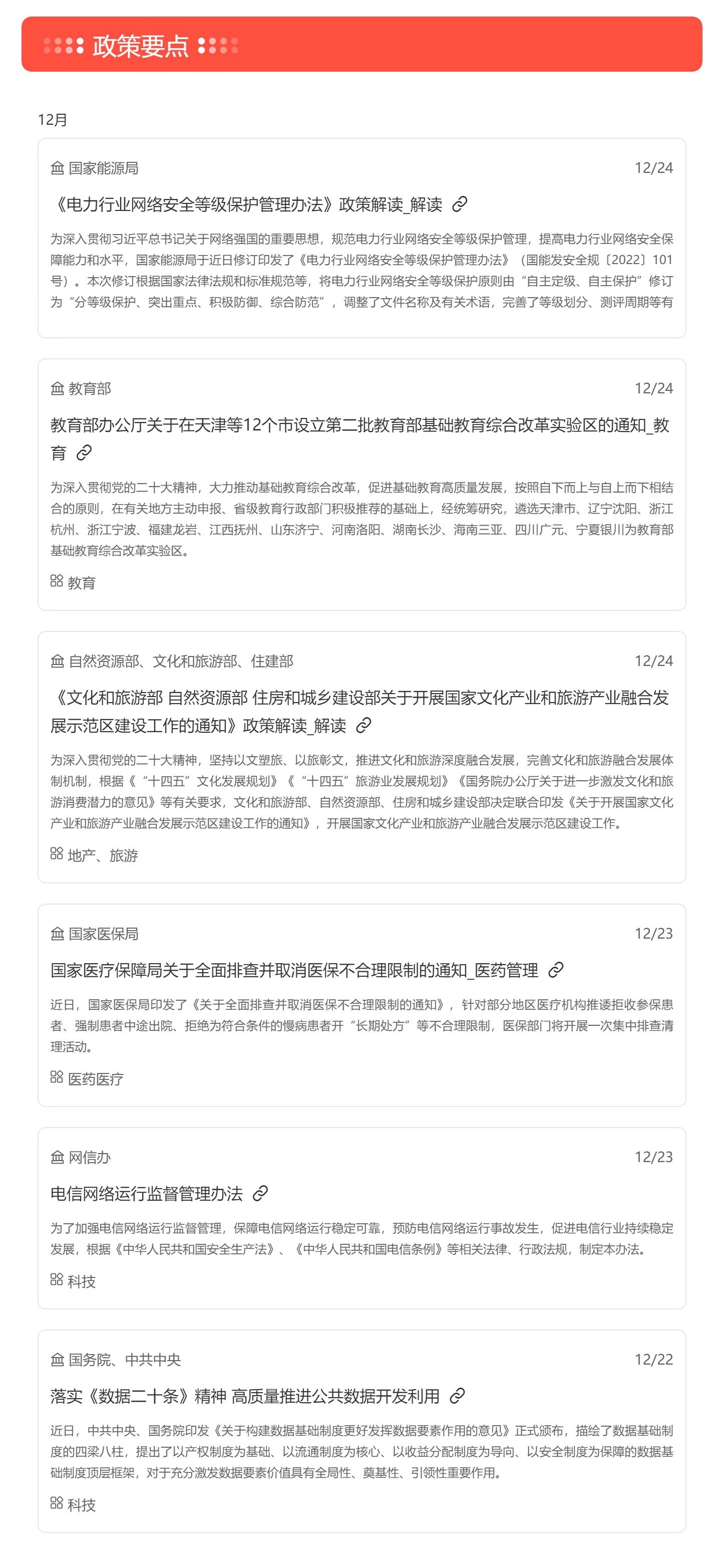 根据梅花数据要政盘点统计,上周共收录重要政策信息共计71条,其中涉及教育、旅游、医疗等多个领域,建议重点关注《关于深化现代职业教育体系建设改革的意见》、《关于开展国家文化产业和旅游产业融合发展示范区建设工作的通知》等政策。