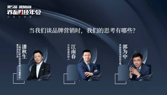 品牌对话围绕《当我们谈品牌营销时,我们的思考有哪些?》这一话题进行探讨。界面新闻高级副总裁郭为中担任对话主持,上海家化联合股份有限公司董事长兼首席执行官潘秋生,分众传媒创始人江南春参与了讨论。