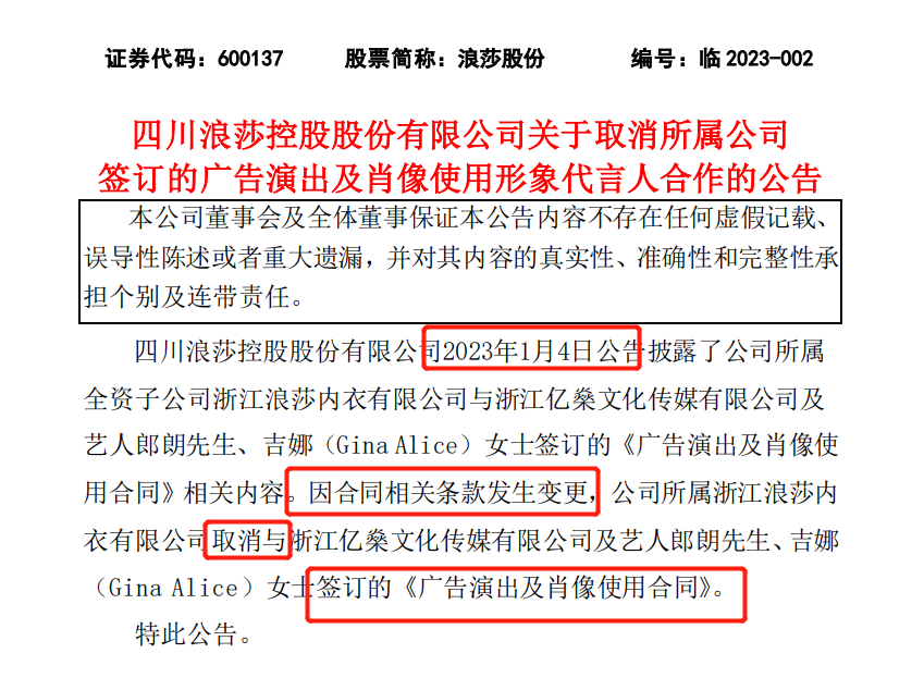 在大家讨论声还未降低时,1月4日晚间,浪莎股份公告称,因合同相关条款发生变更,公司所属浙江浪莎内衣有限公司取消与浙江亿燊文化传媒有限公司及艺人郎朗先生、吉娜 (Gina Alice)女士签订的《广告演出及肖像使用合同》。