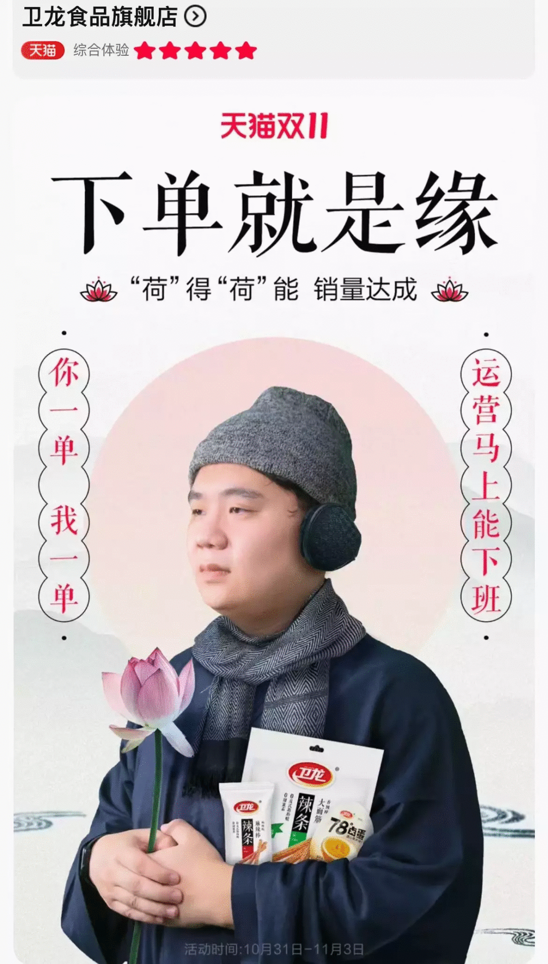 今年双11期间,卫龙竟将官方旗舰店设计修改为“佛系催下单”。趣味的佛系文案与“不争不抢”的心态,与其他店铺内卷的双11画风,形成鲜明对,反向带货成功。