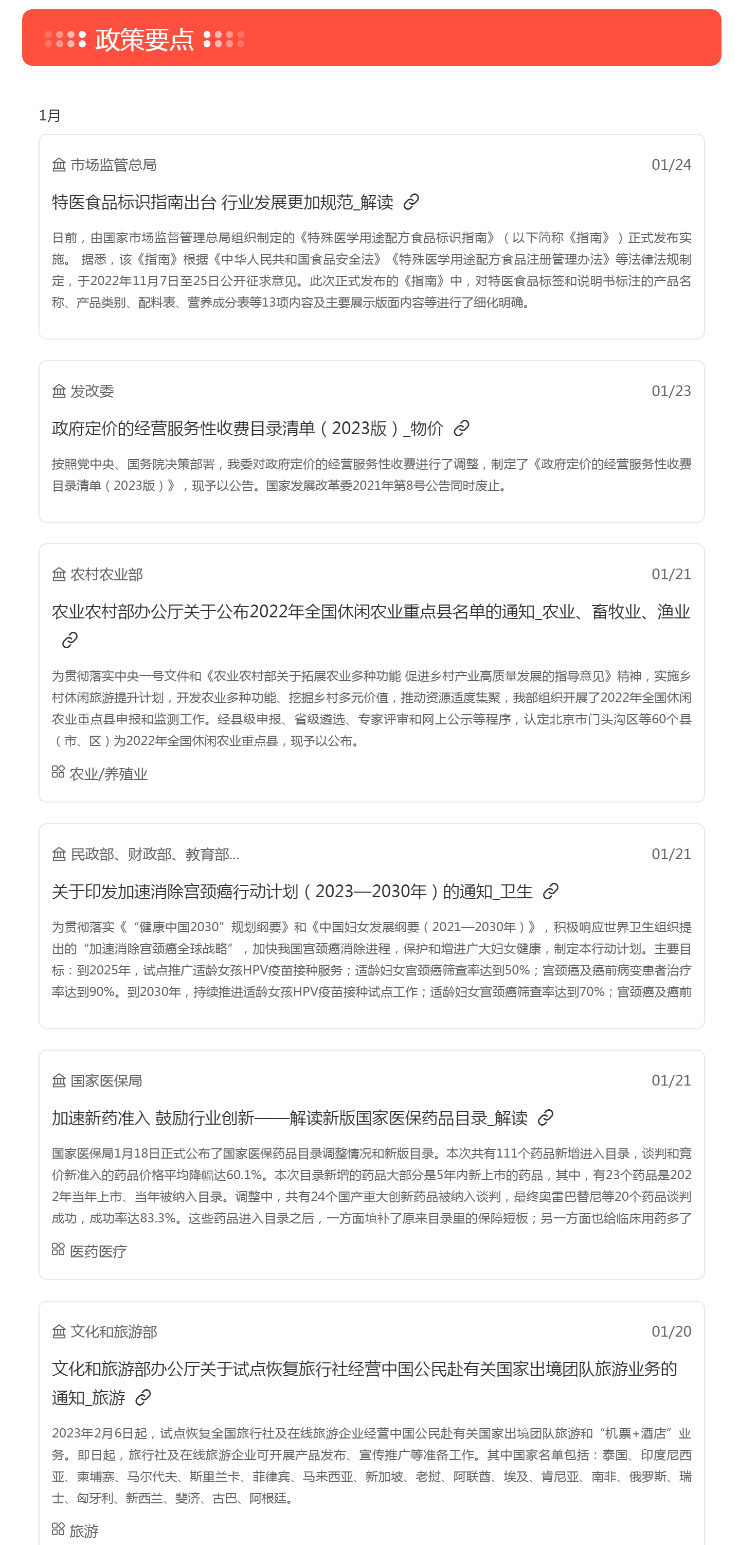 根据梅花数据要政盘点统计,上周共收录重要政策信息共计99条,其中涉及医疗、旅游、工业制造等多个领域,建议重点关注《特殊医学用途配方食品标识指南》、《“机器人+”应用行动实施方案》等政策。