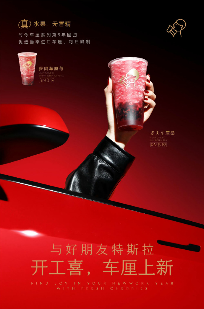 1月30日,新年开工之际,喜茶联手特斯拉推出“开工喜,车厘上新”活动,为广大打工人带来“新年一路领跑、喜悦向前”的美好祝愿。