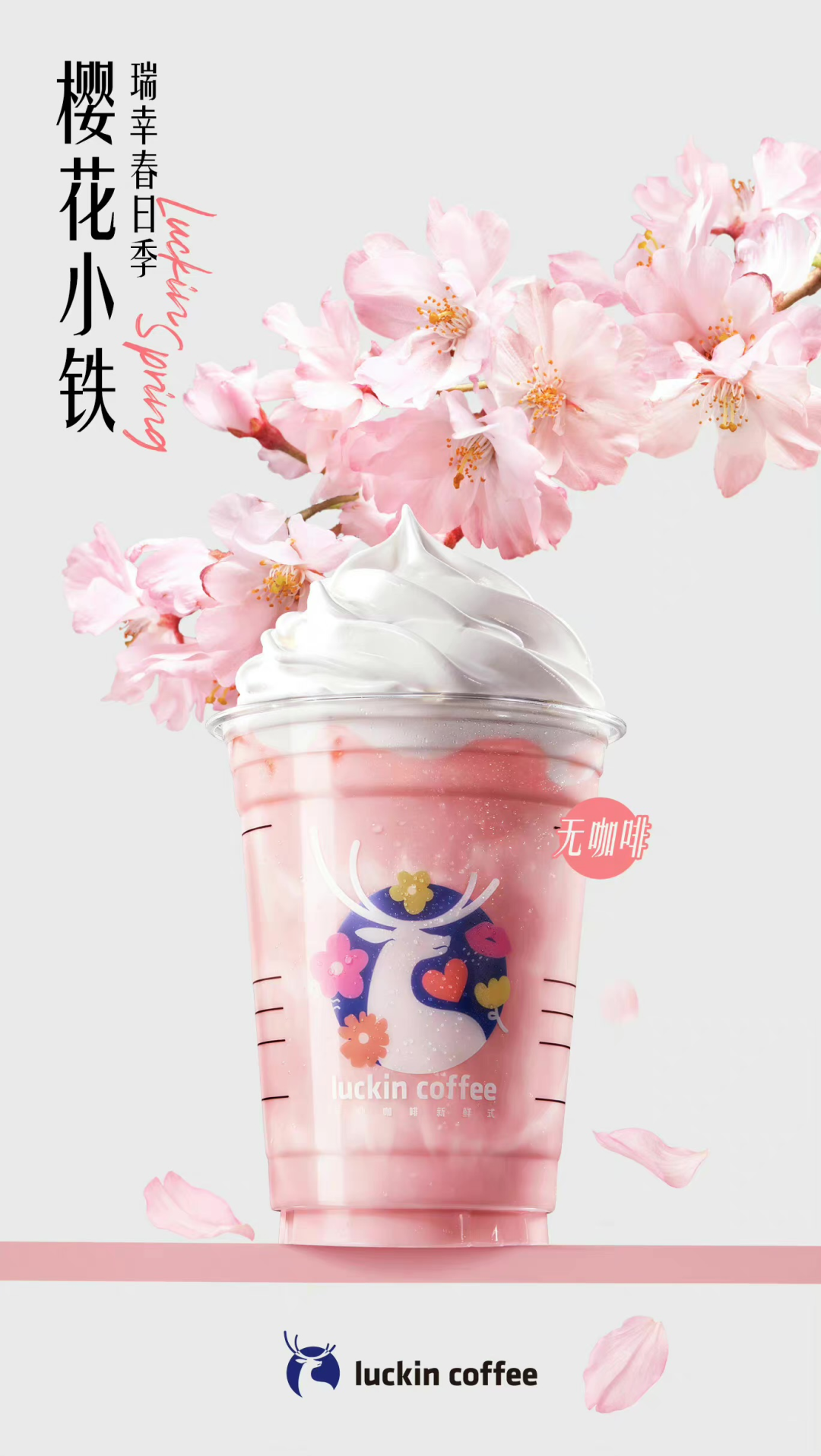 瑞幸也没放过樱花季。小蓝杯瞬间变身小粉杯,诱人奶油顶加入粉色杯身点缀,颜值满分!