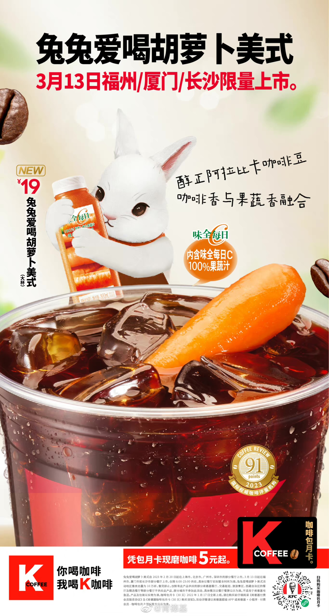 最近,KFC官宣和味全每日C推出联名新品——兔兔爱喝胡萝卜美式。